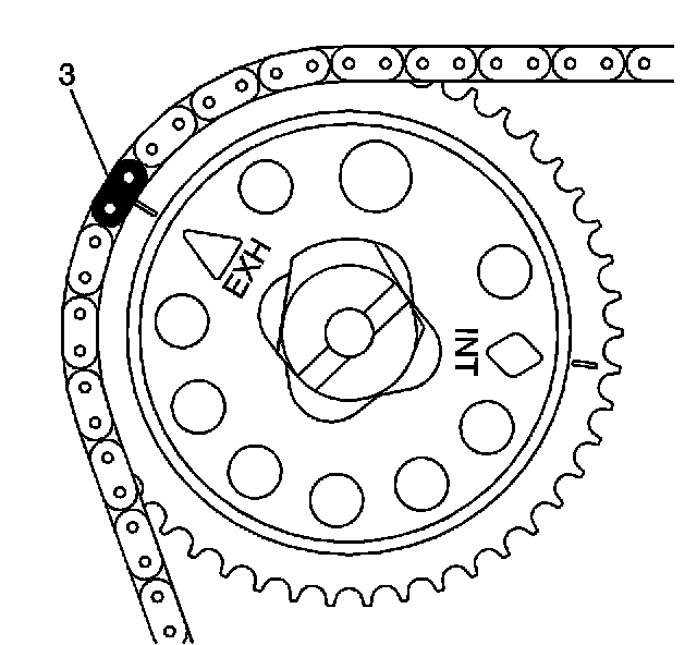8. Ensure that the EXH triangle on the exhaust camshaft sprocket is aligned with the matching colored link (3).
