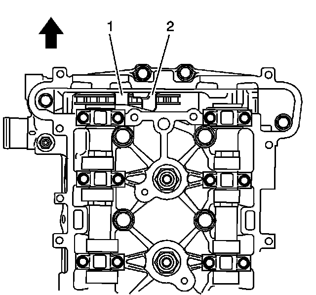 16. Lower the timing chain through the opening in the top of the cylinder head. Carefully ensure that the chain goes around both sides of the cylinder block bosses (1,2).