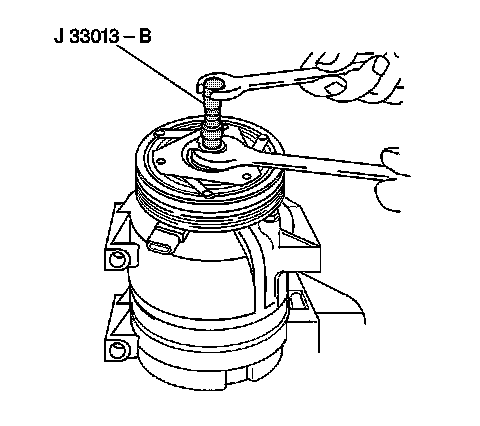 6. Back the body of the J 33013-B remover-installer off then thread the center screw several turns into the end of the compressor shaft.