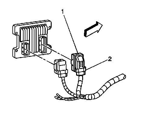 3. Push down on the locking tab (1) and pull up on the release lever (2) and disconnect the PCM harness connectors.
