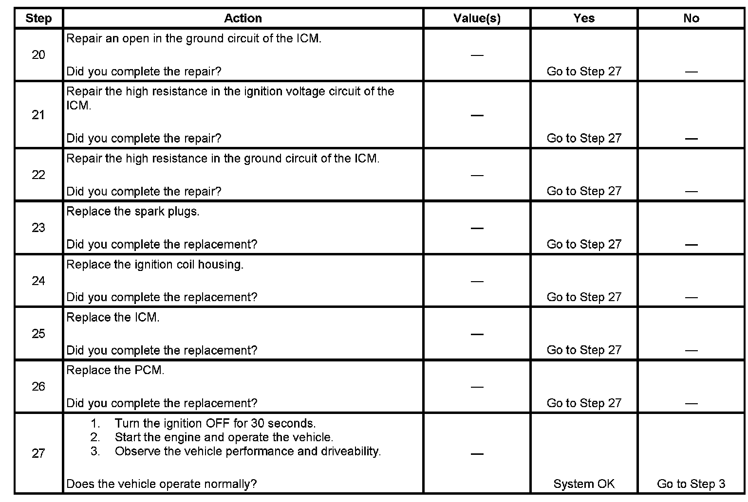 Each ignition coil supplies secondary voltage to a pair of spark plugs. This is called a waste spark ignition system. The powertrain control module (PCM) supplies a signal on each of the ignition control (IC) timing control circuits to the ignition control module (ICM). The ICM fires the correct ignition coil at the correct time based on the signals. The ICM detects if cylinder 1 or cylinder 3 is on the compression stroke by sensing the secondary voltage and polarity of each side of the ignition coil. The ICM detects this voltage with sensing circuitry integrated into each ignition coil. The higher voltage is on the compressing cylinder. This is called compression sense ignition. The ICM provides a synthesized cam signal to the PCM based on these inputs. The PCM uses the cam signal to synchronize fuel injection.