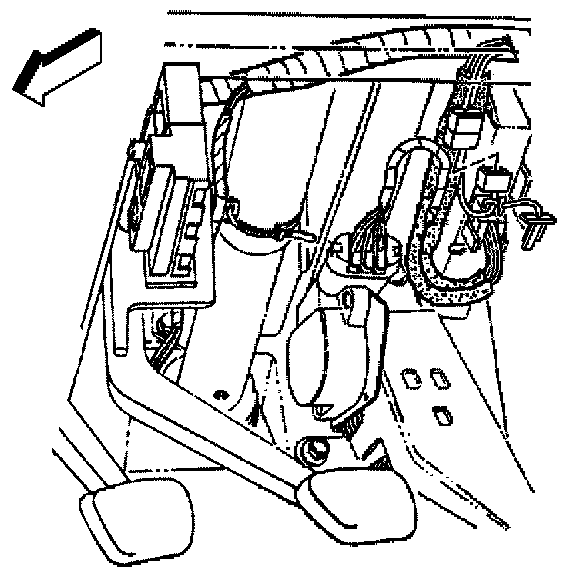11. Lower and remove the closeout panel. Release the notch, in the right-hand forward edge of the closeout panel, from the tab on the accelerator pedal bracket.
