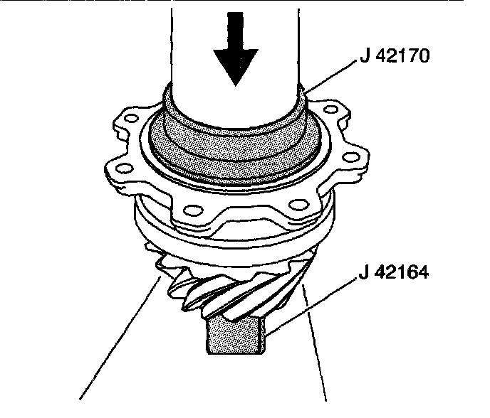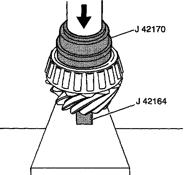 5. Press the bearing onto the pinion shaft using J42170, J42164, and a hydraulic press.