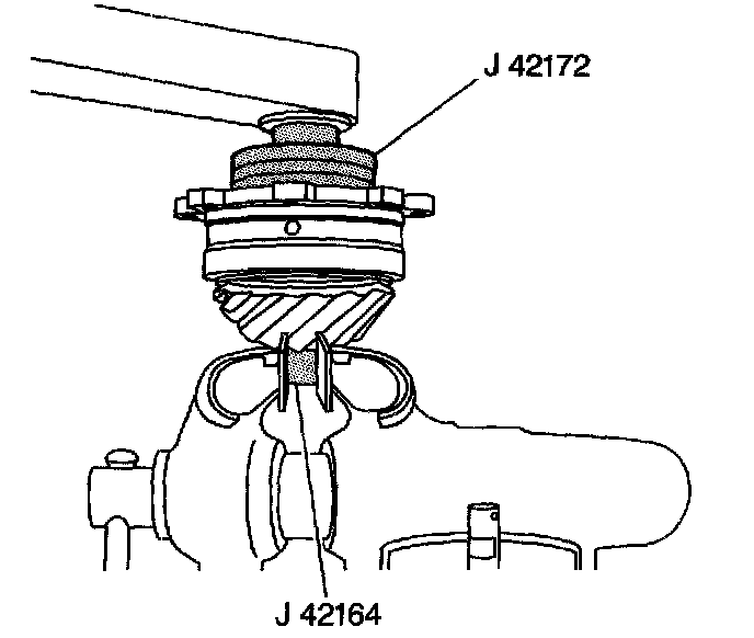 3. Install the bearing onto the pinion shaft using the J42170, J42164, and a hydraulic press.