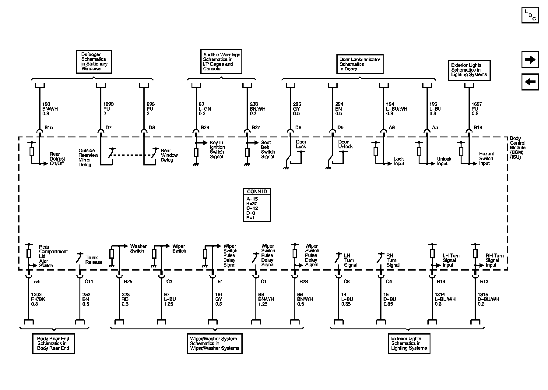 Rear Defogger, Audible Warnings, Door Lock, Exterior Lights, Trunk Release, and Wiper/Washer System References
