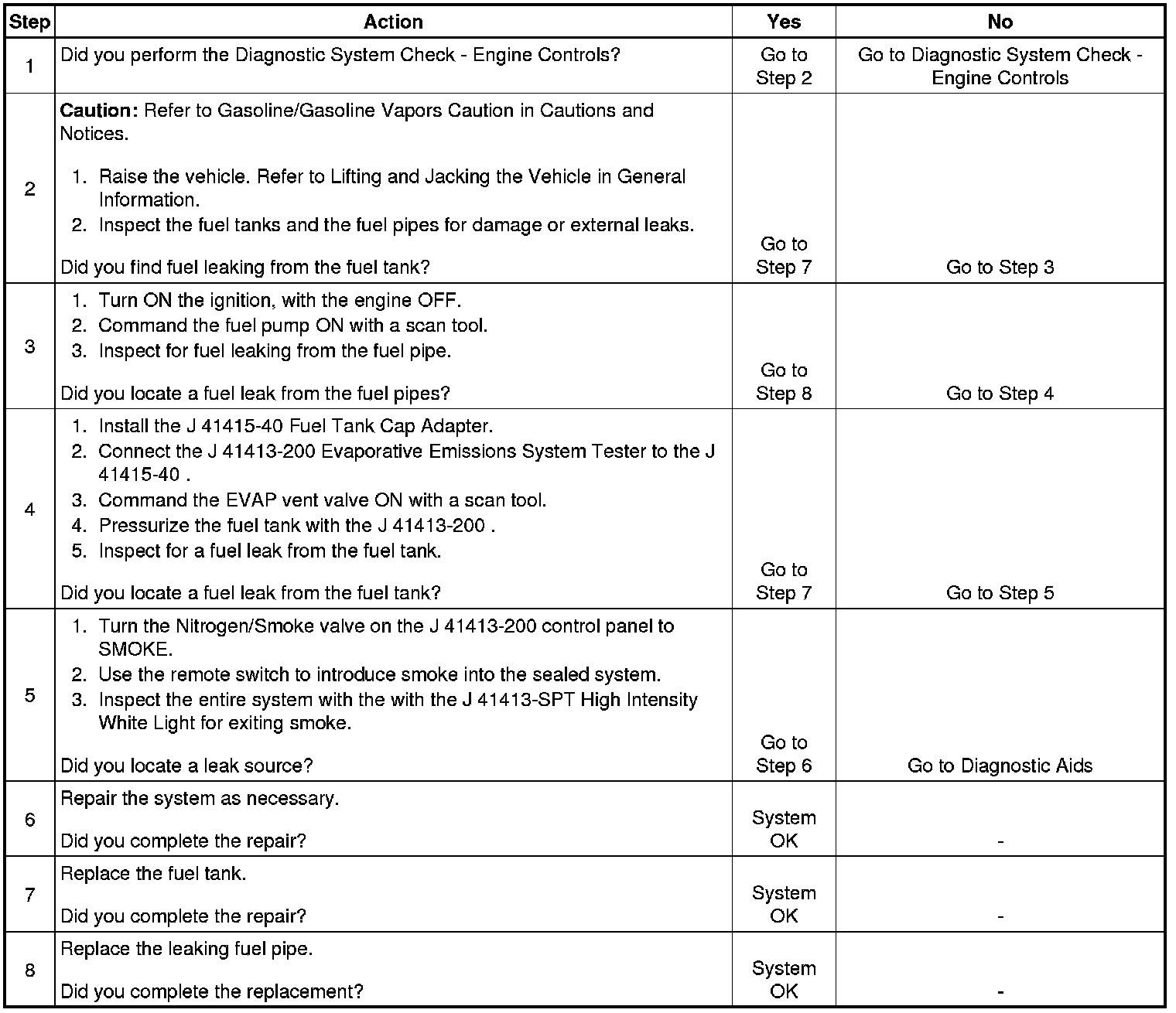 The fuel tank leak test is used to locate any fuel or fuel vapor escaping the fuel tank area. Fuel vapors escaping above the fuel level will be detected when the evaporative emissions (EVAP) leak diagnostic completes one test cycle.