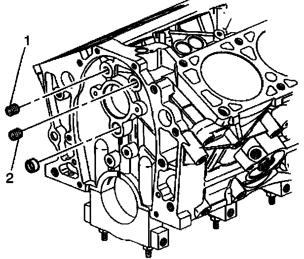 5. Apply sealer GM P/N 12346004, (Canadian P/N 10953480) or the equivalent to the front oil gallery plug threads (1 and 2).