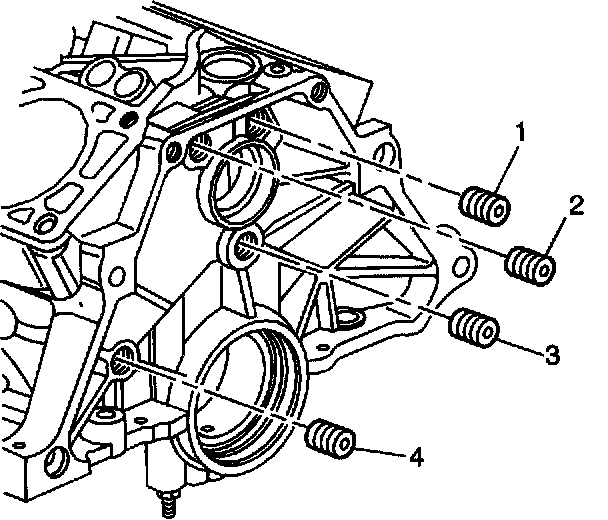 8. Apply sealer GM P/N 12346004, (Canadian P/N 10953480) or the equivalent to the rear oil gallery plug threads (1 and 4).