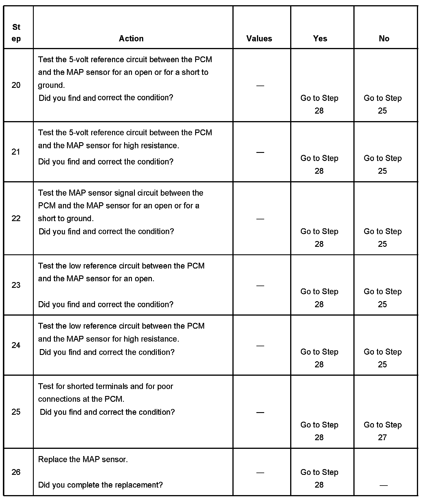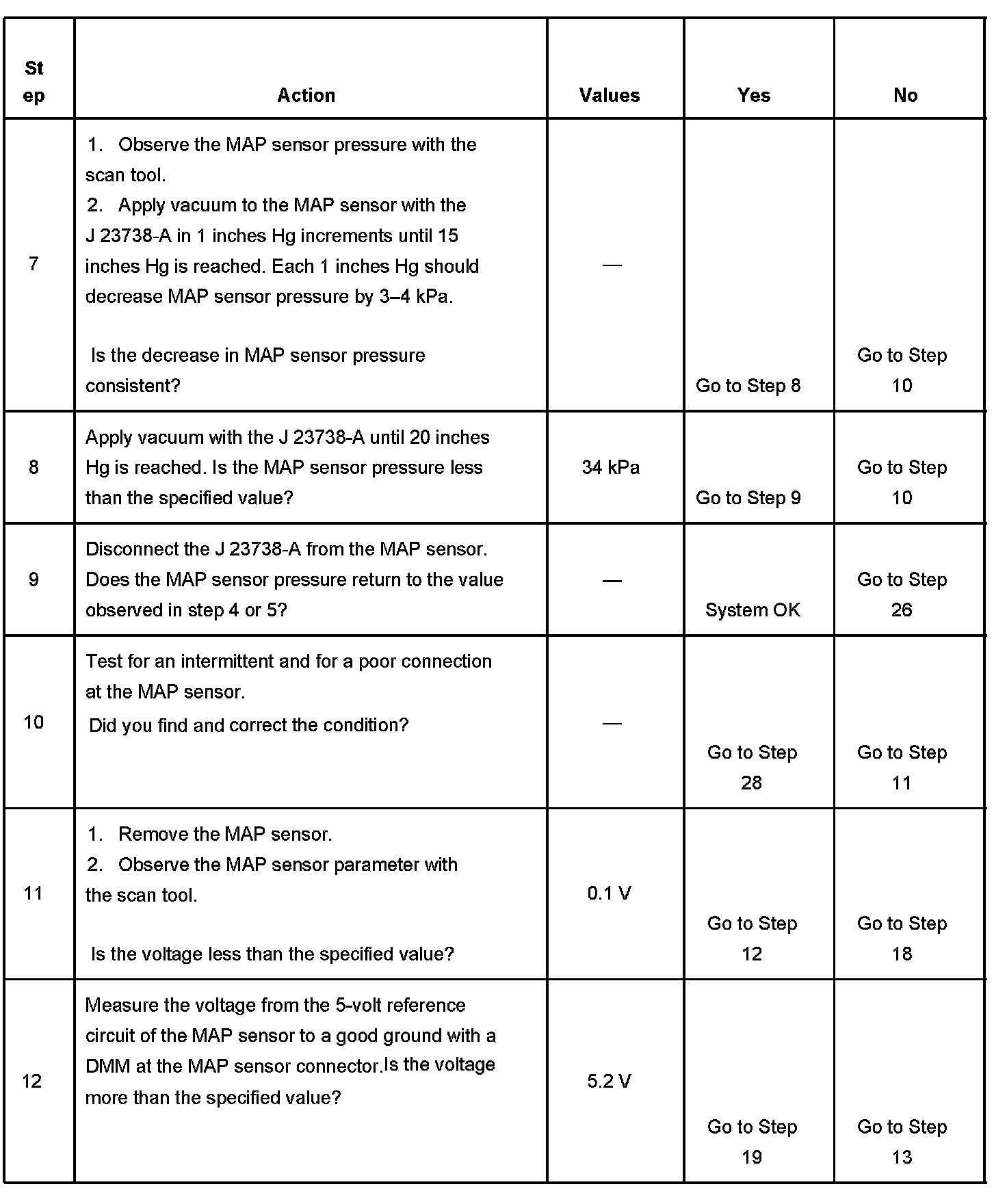 The manifold absolute pressure (MAP) sensor responds to changes in intake manifold pressure which gives an indication of the engine load. The MAP sensor has a 5-volt reference circuit, a low reference circuit, and a signal circuit. The powertrain control module (PCM) supplies 5 volts to the MAP sensor on the 5-volt reference circuit and provides a ground on the low reference circuit. The MAP sensor provides a signal to the PCM on the MAP sensor signal circuit, which is relative to the pressure changes in the manifold. With low MAP, such as during idle or deceleration, the PCM should detect a low MAP sensor signal voltage. With high MAP, such as ignition ON, engine OFF or wide open throttle (WOT), the PCM should detect a high MAP sensor signal voltage. The MAP sensor is also used in order to calculate the barometric pressure (BARO) when the ignition switch is turned ON, with the engine OFF. The BARO reading may also be updated whenever the engine is operated at WOT. The PCM monitors the MAP sensor signal for voltage outside of the normal range. If the PCM detects a MAP sensor signal voltage that is excessively low, DTC P0107 sets. If the PCM detects a MAP sensor signal voltage that is excessively high DTC P0108 sets.