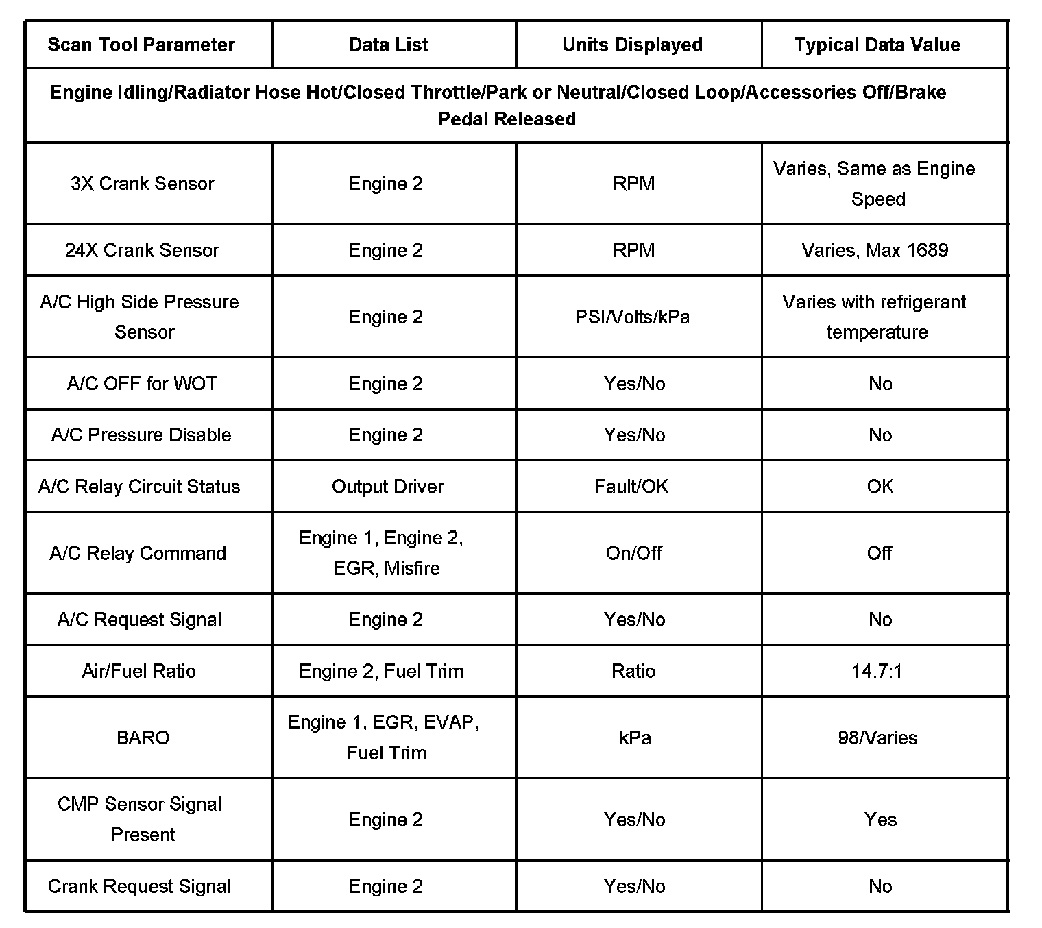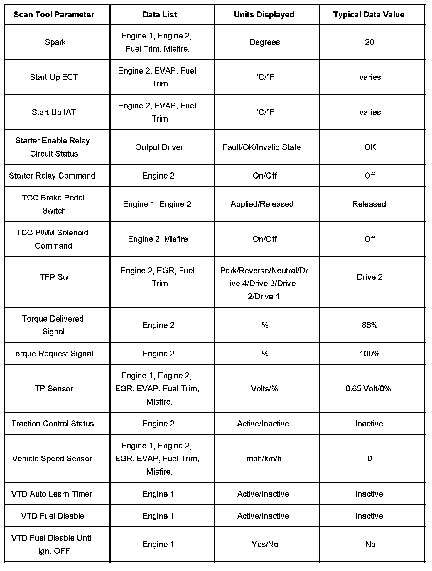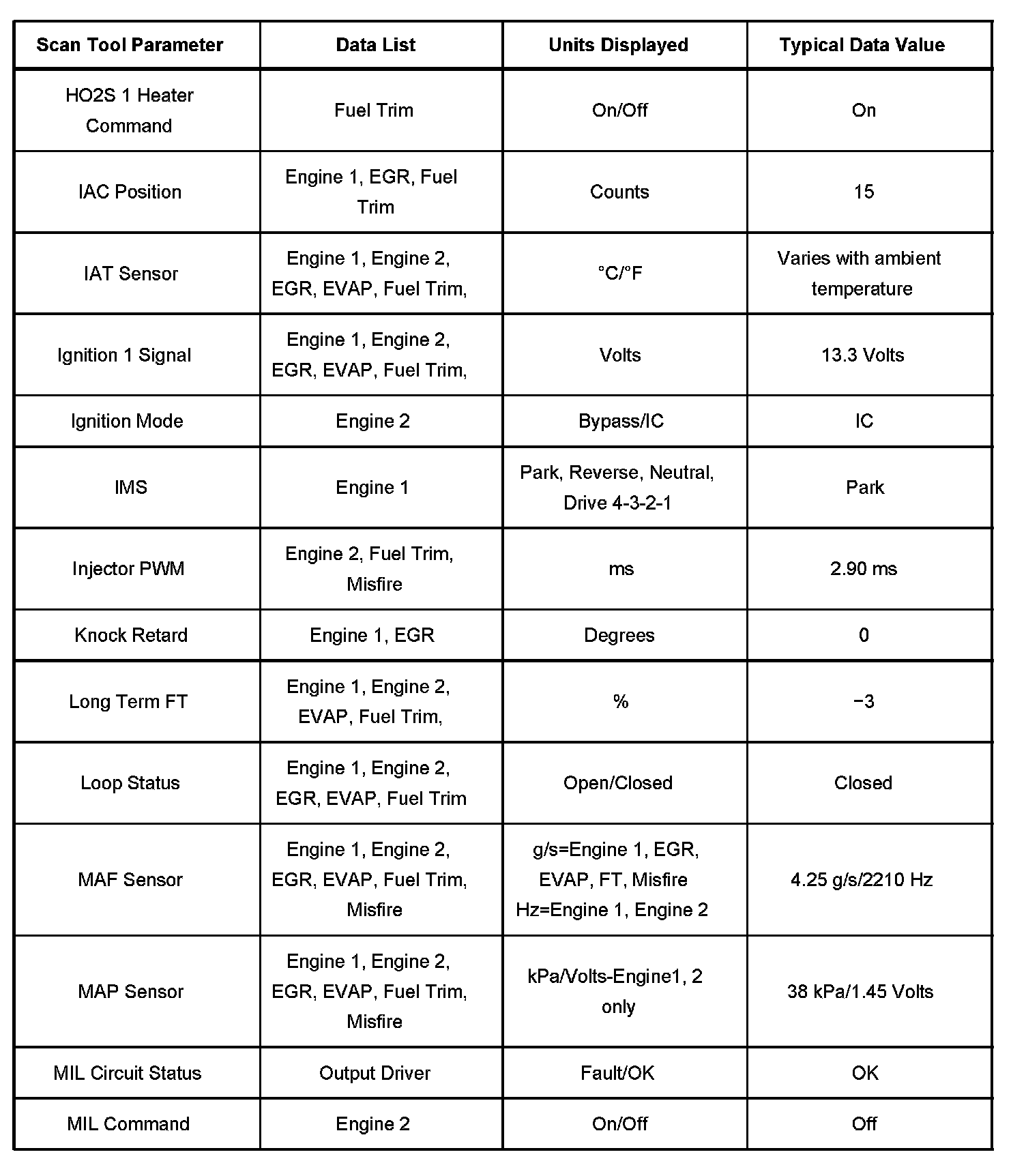 Use the Typical Scan Data Values table only after the Diagnostic System Check-Computers and Control Systems has been completed, no DTCs were noted and you have determined the on-board diagnostics are functioning properly. Scan tool values from a properly running engine may be used for comparison with the engine you are diagnosing. The Typical Scan Data values represent values that would be seen on a normally running engine.