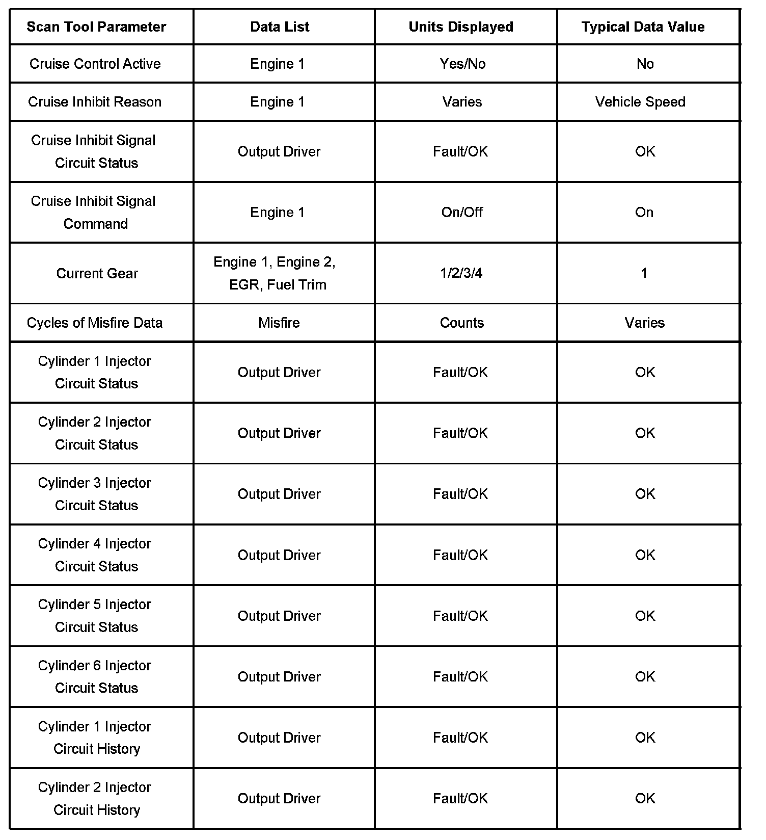 - Misfire Data-Contains information specific to the misfire diagnostics and parameters required to verify proper operation with regard to misfire.