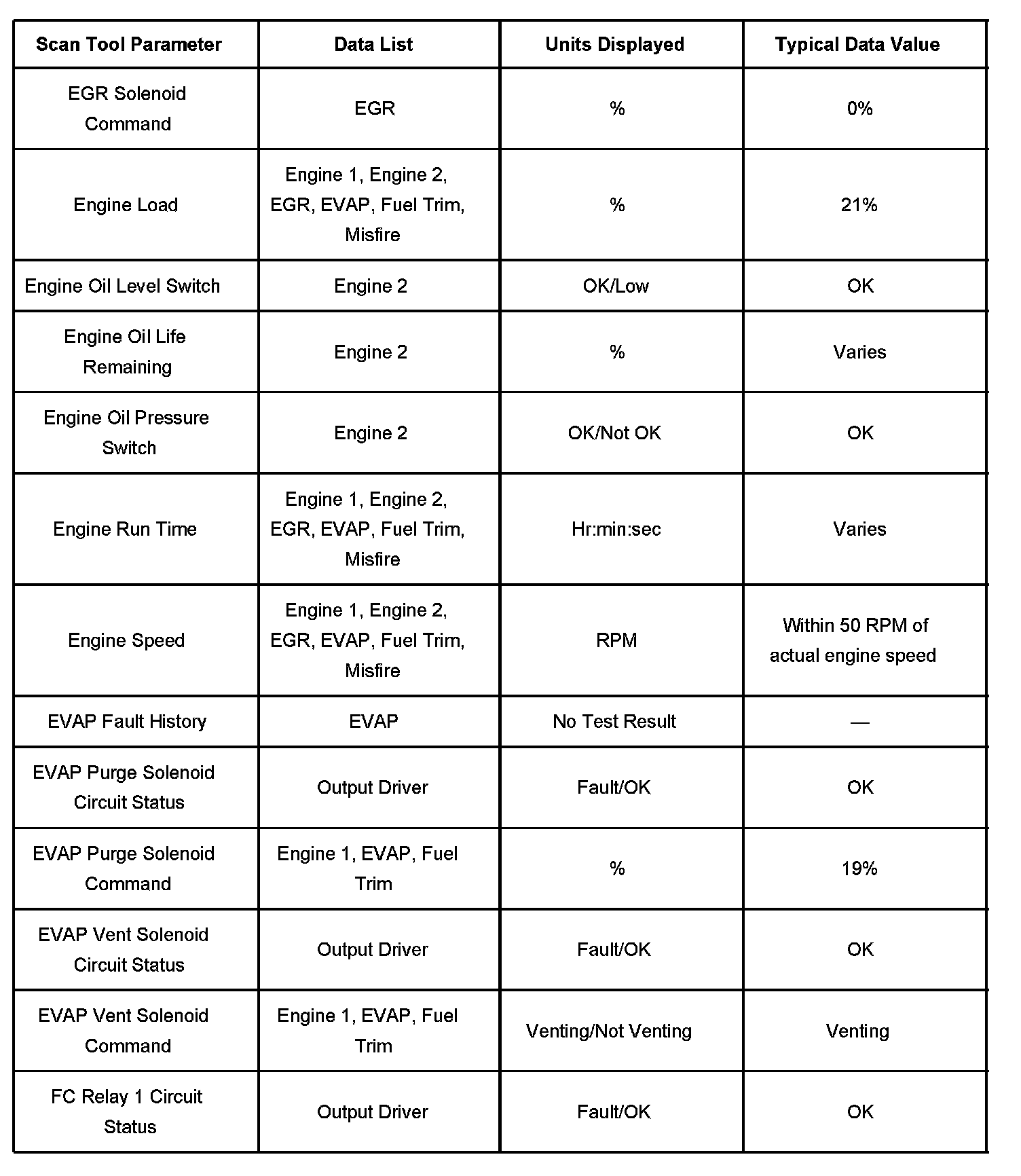 - Exhaust gas recirculation (EGR) Data-Contains information specific to the EGR system. This list displays parameters required to verify proper EGR system operation