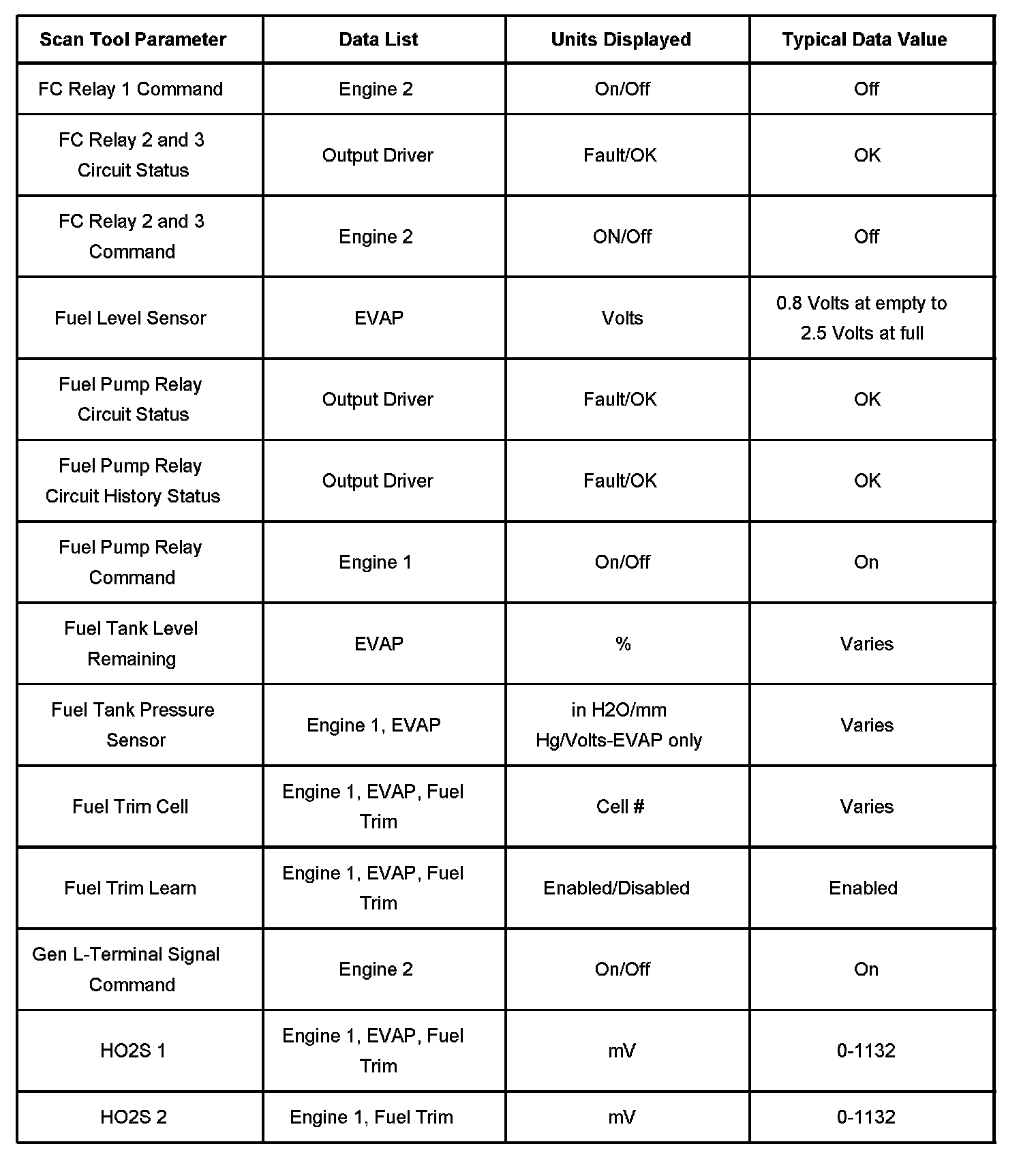 - Fuel Trim Data-Contains information specific to the fuel trim operation. Also displays parameters required to verify proper fuel trim operation.