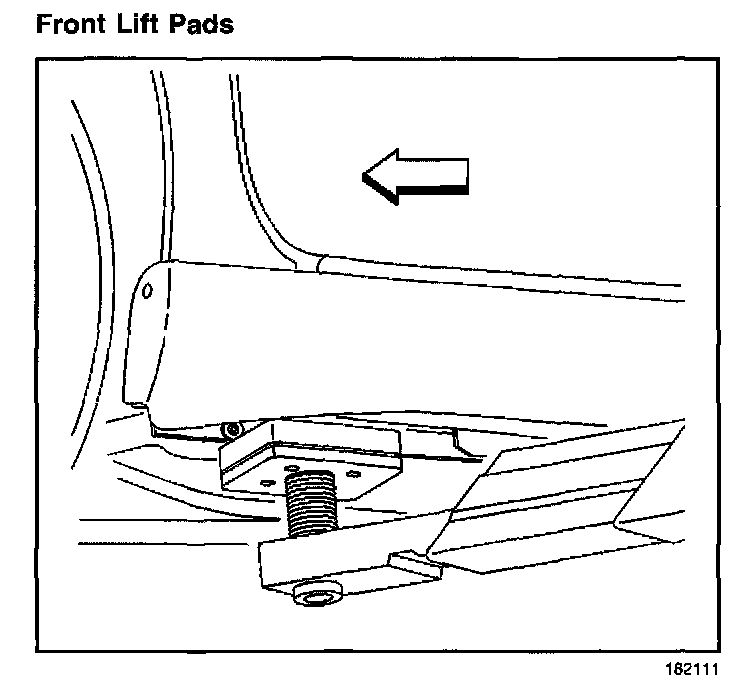 When lifting the vehicle with a frame-contact lift, place the front lift pads at the front pinchweld flanges.