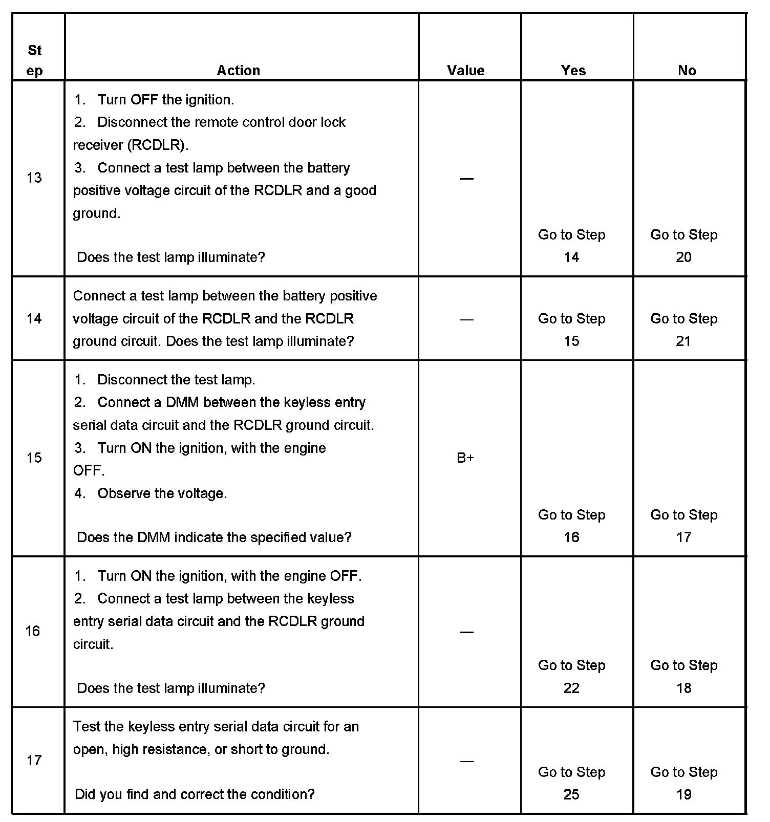 16. B+ voltage should be present on the serial data terminal when tested with a DMM, but should not illuminate the test lamp. An illuminated test lamp indicates a short to voltage in the serial data circuit.