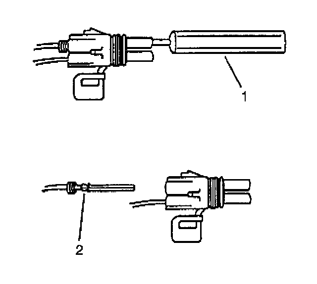 4. Insert the Weather Pack(R) terminal removal tool into the front (mating end) of the connector cavity until it rests on the cavity shoulder (1).