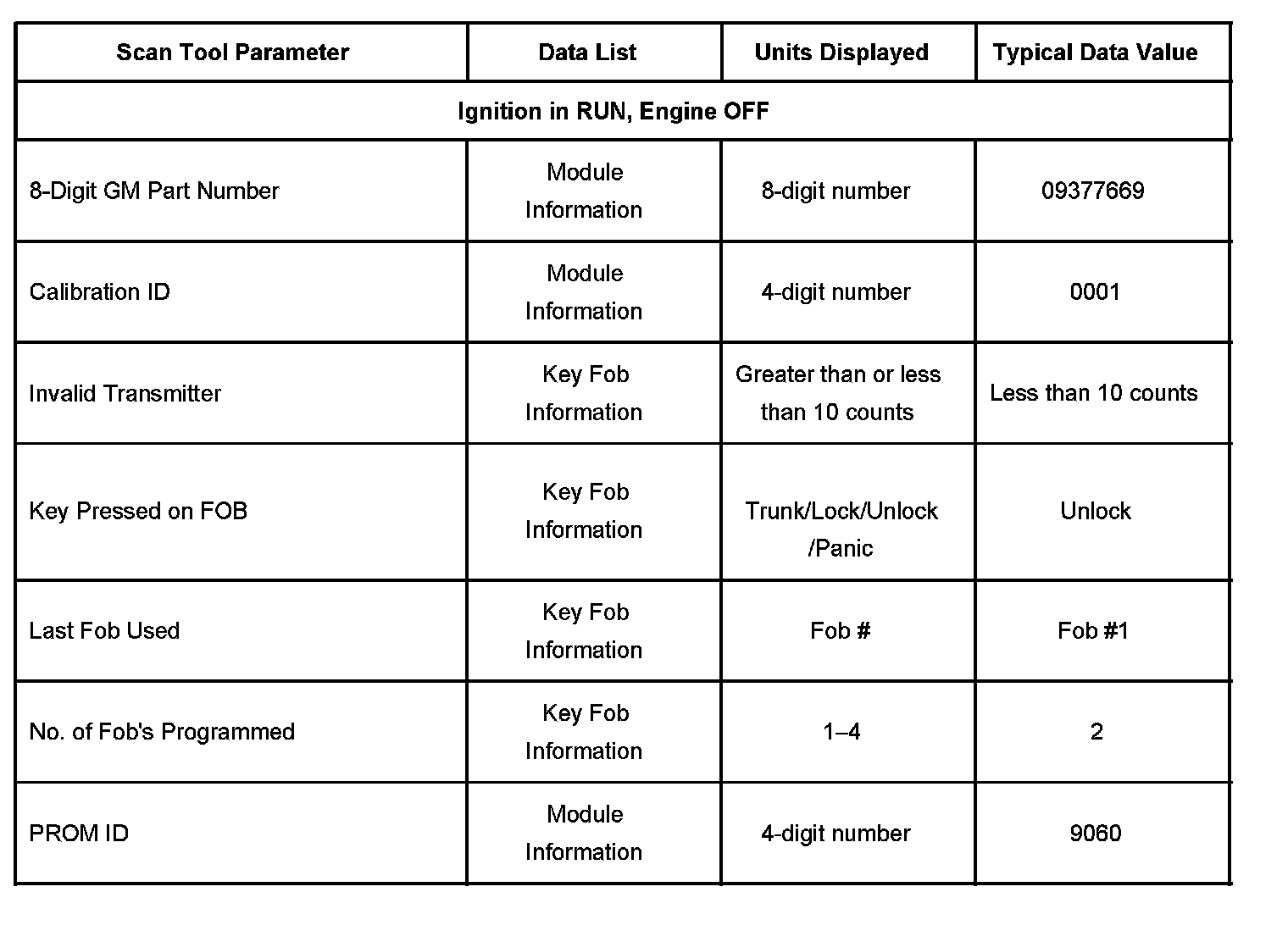 The Keyless Entry Scan Tool Data List contains all of the keyless entry related parameters that are available on the scan tool. The parameters in the list are arranged in alphabetical order. The column, Data List, indicates the location of the parameter within the scan tool menu selections. Use the Keyless Entry Scan Tool Data List as directed by a diagnostic table or in order to supplement the diagnostic procedures. Begin all of the diagnostic procedures with Diagnostic System Check - Vehicle. Use the Scan Tool Data List only after the following is determined:
