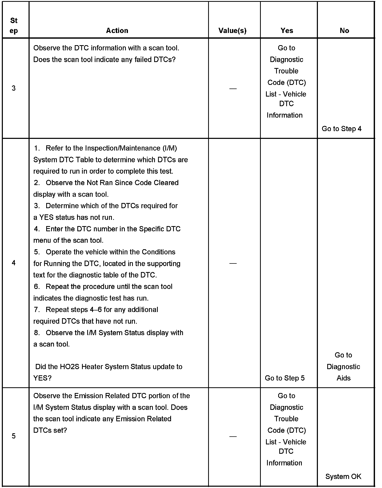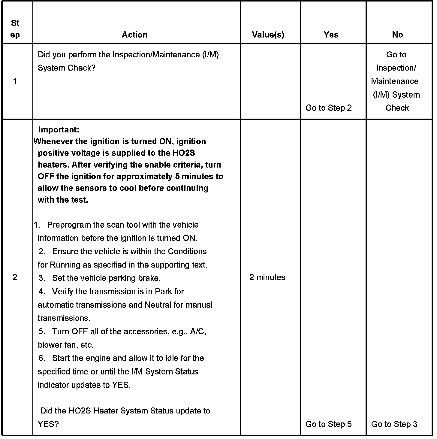 The purpose of this test is to satisfy the enable criteria necessary to execute inspection/maintenance (I/M) readiness diagnostics for the heated oxygen sensor (HO2S) system. The test may be used to set the I/M System Status to YES. The I/M System Status display on the scan tool provides an indication of whether the control module has completed the required test. The required test is complete when either all of the DTCs comprising the test have run and passed, or when any one of the DTCs comprising the test has illuminated the malfunction indicator lamp (MIL). Once the test is complete, the I/M System Status display will indicate YES in the Completed column.