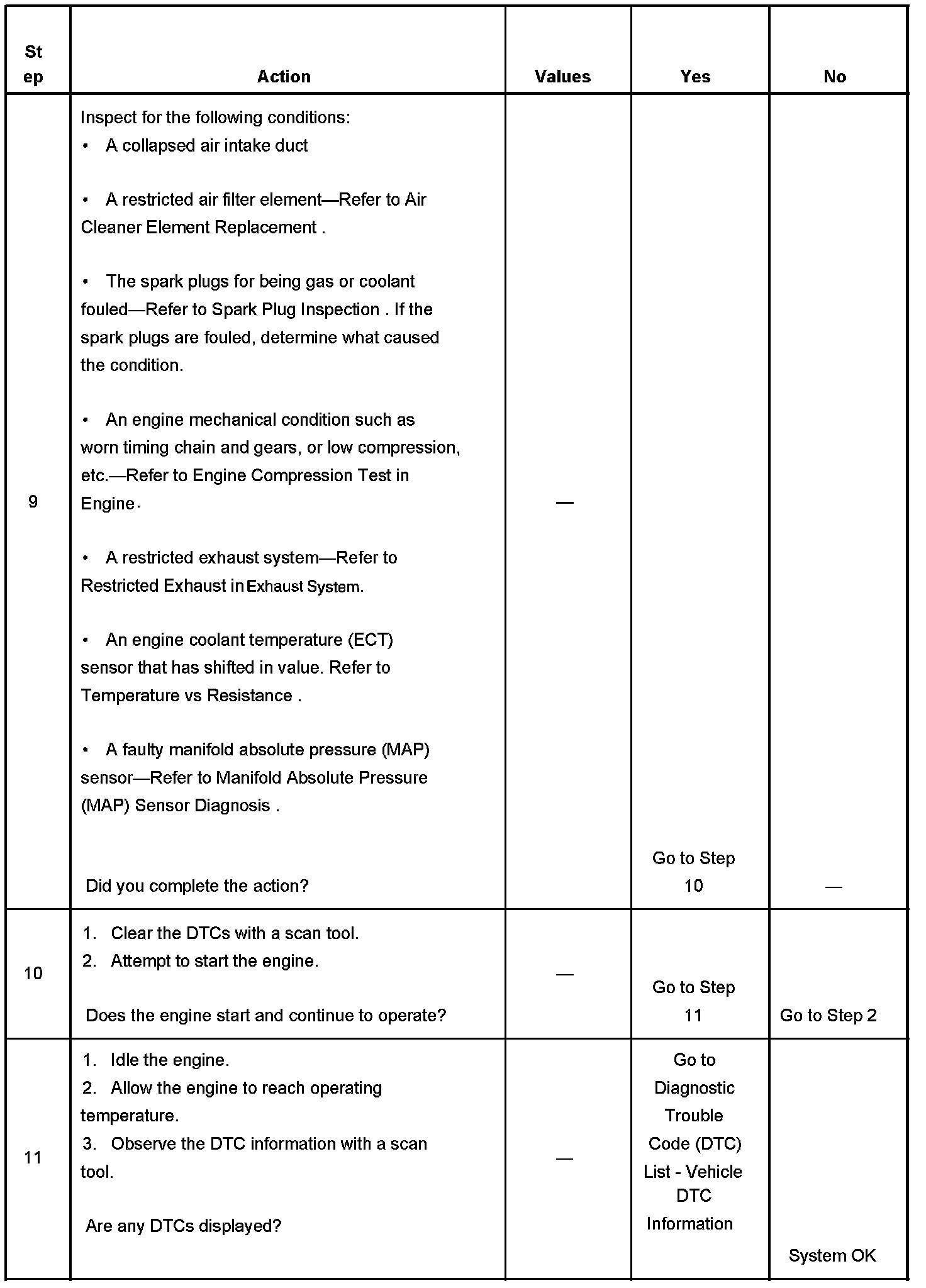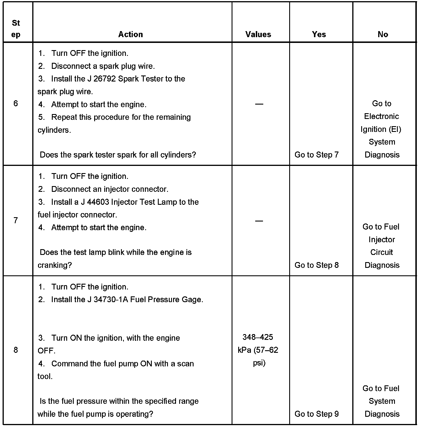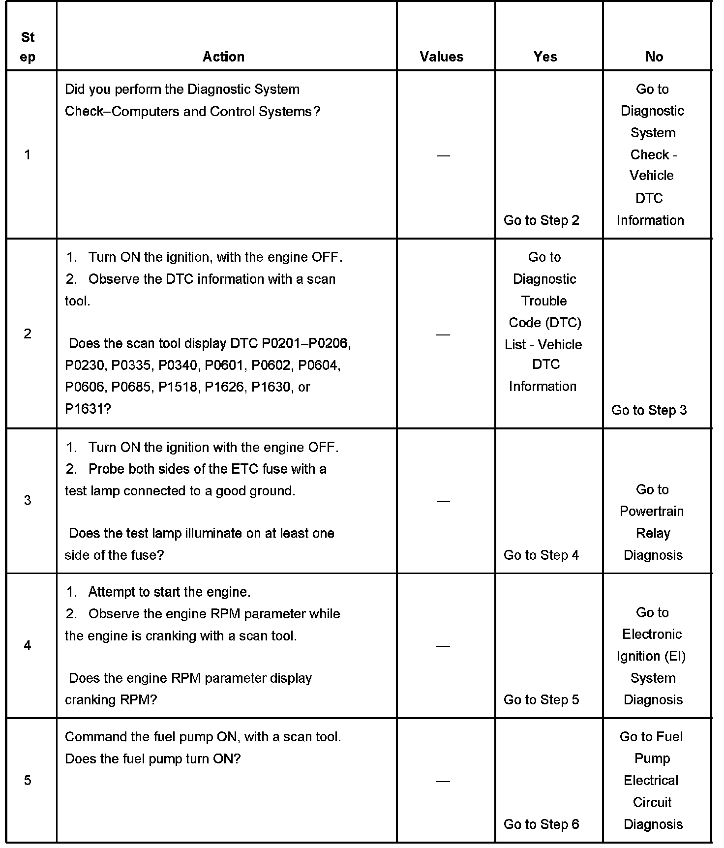 The Engine Cranks but Does Not Run diagnostic table is an organized approach to identifying a condition that causes an engine not to start. The Engine Cranks but Does Not Run diagnostic table directs the service technician to the appropriate system diagnosis.