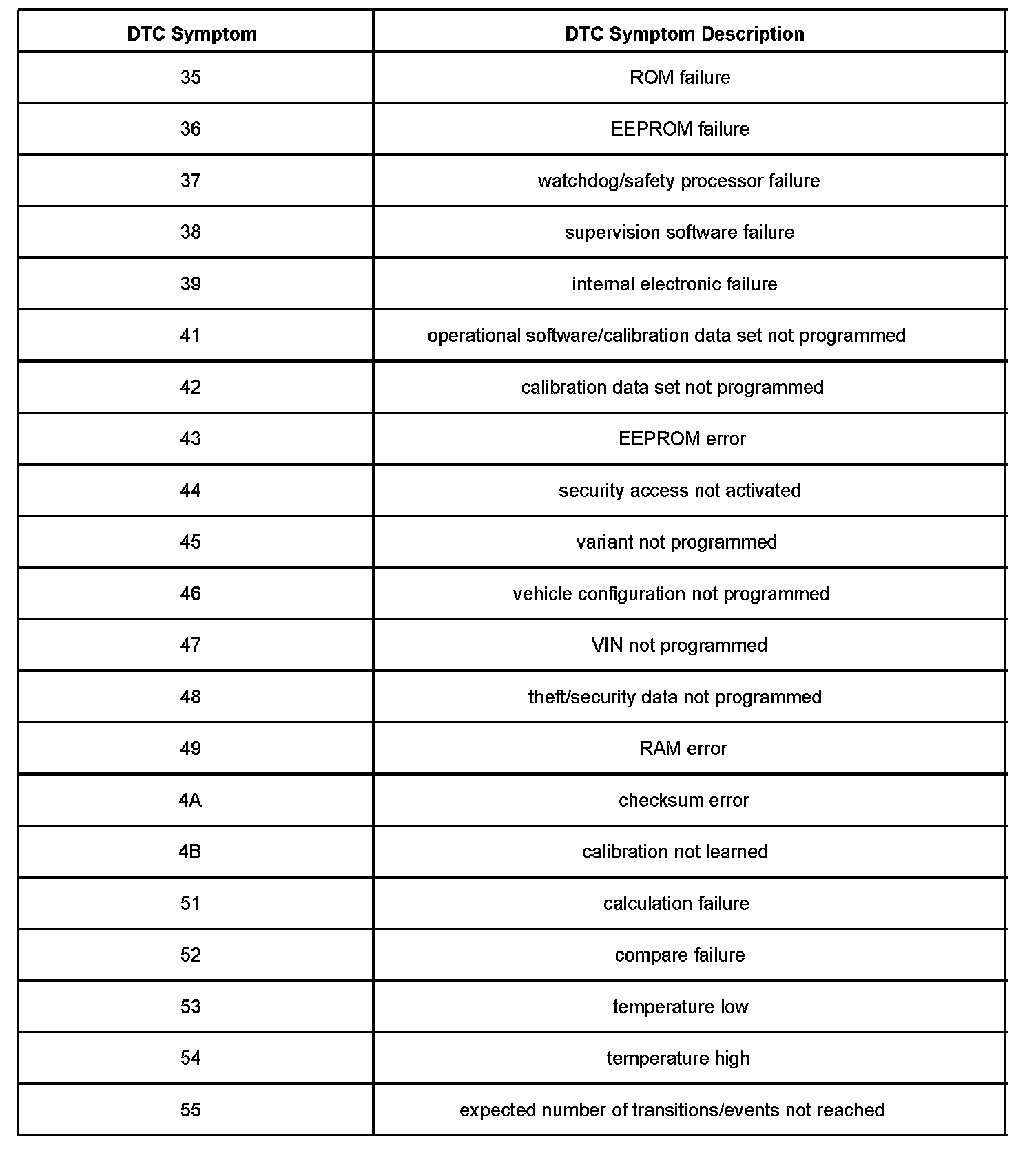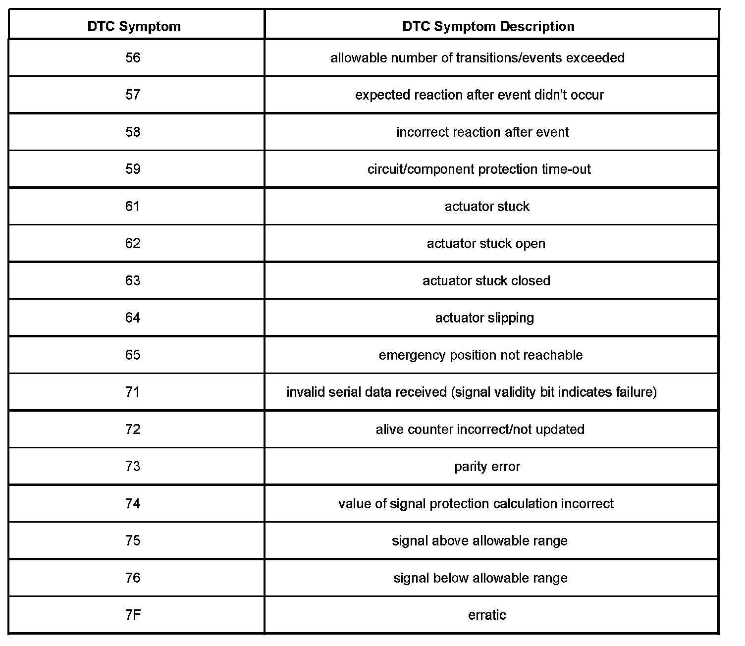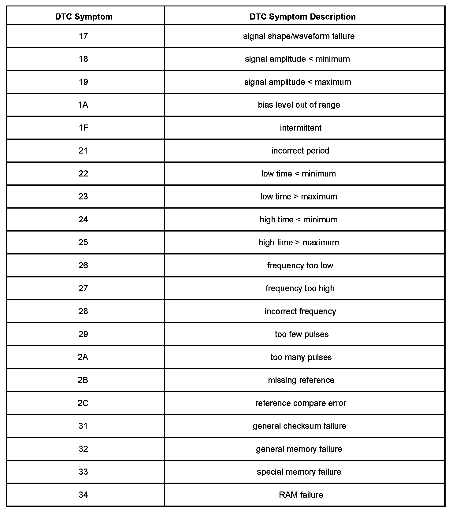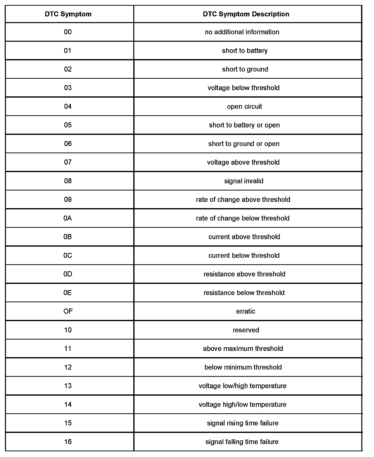 The DTC symptom is made up of 2 alphanumeric digits. The first digit following the DTC indicates the DTC symptom category. There are 16 possible categories available in the range of 0 through the letter F. Currently there are 8 categories in use, 0 through 7. These 8 categories together with their definitions are given below.