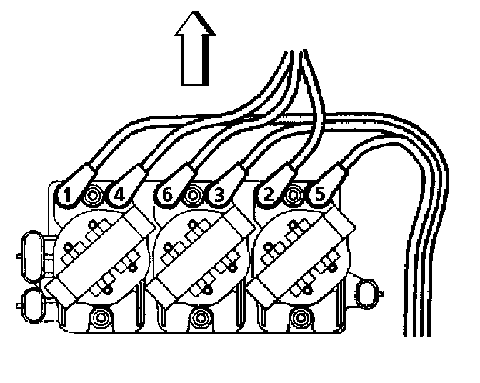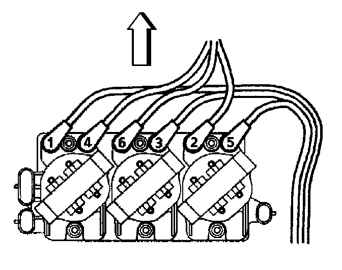 2. Note position of spark plug wires for installation and disconnect the spark plug wires from the ignition coils.