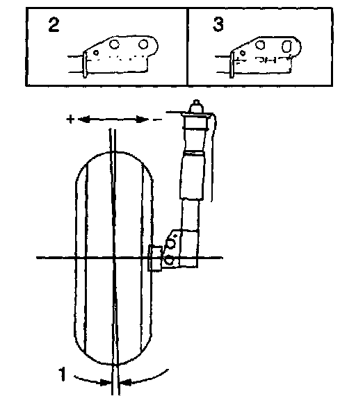 3. Loosen the hex nut on the tie rod (2). Turn the tie rod shaft (1) in order to obtain the proper toe angle.