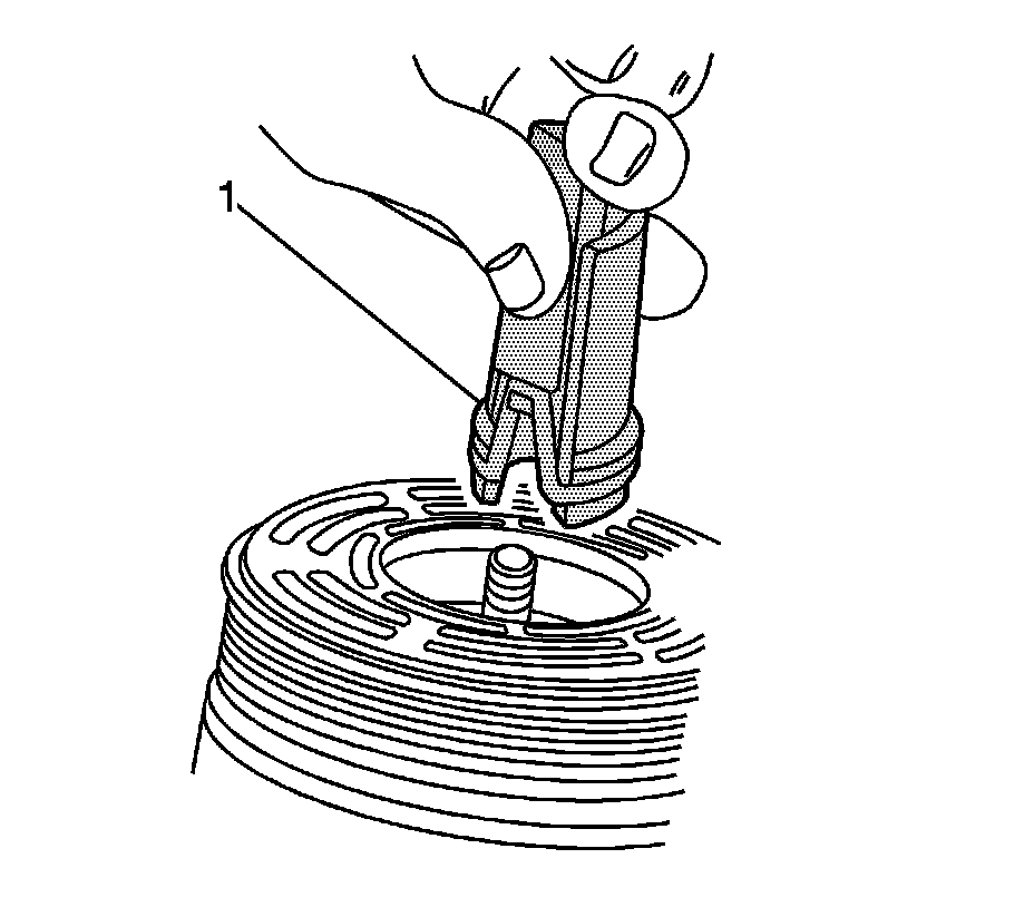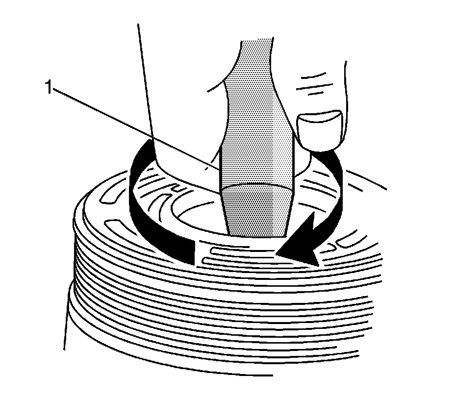 7. Fully engage the knurled tangs of the J 23128-A (1) into the recessed portion of the seal by turning the handle clockwise. Remove and discard the seal from the compressor with a rotating-pulling motion. The handle should be hand-tightened securely. Do not use a wrench or pliers to tighten the handle.