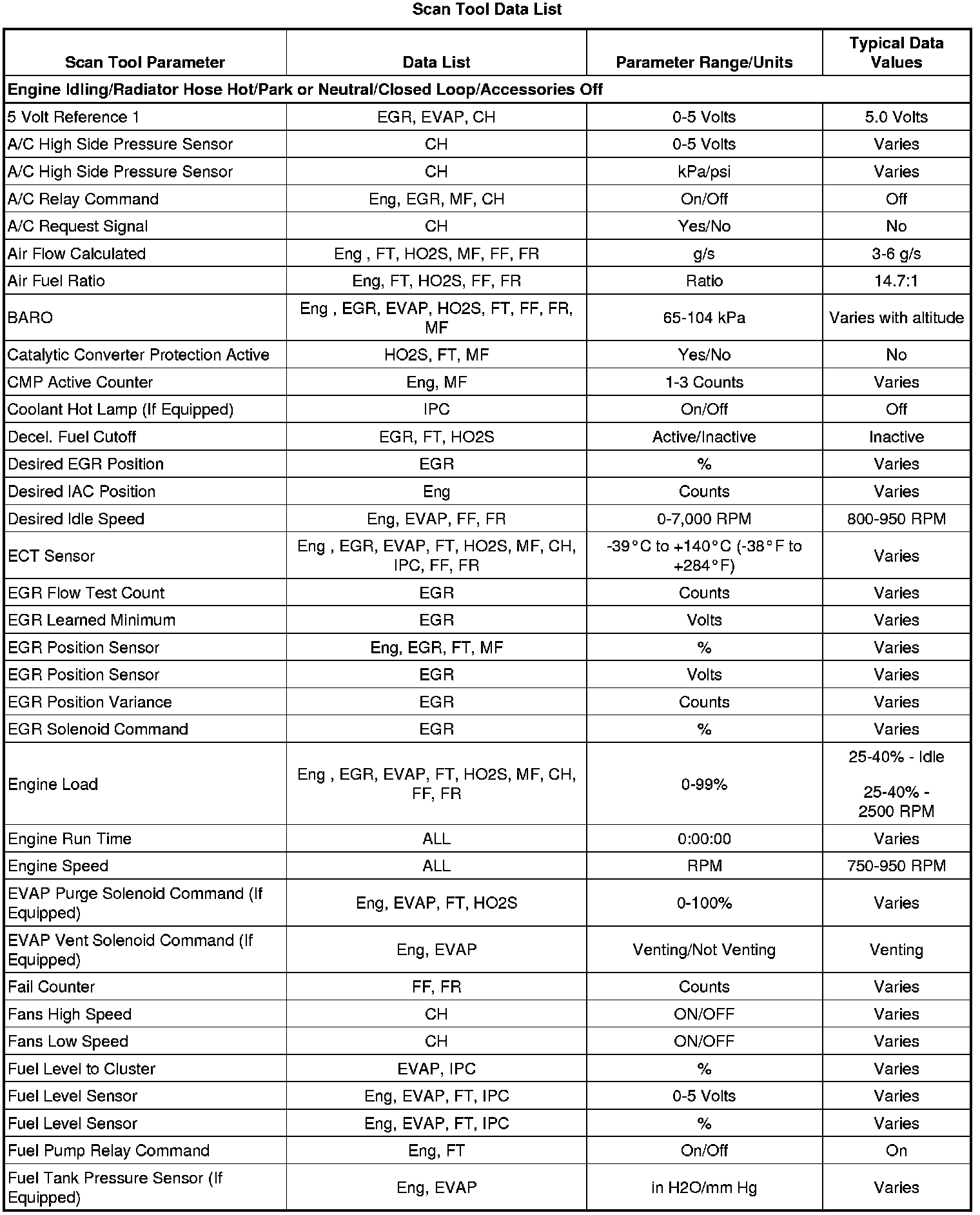 The Engine Scan Tool Data List contains all engine related parameters that are available on the scan tool. The list is arranged in alphabetical order. A parameter may appear in any one of the data lists, and in some cases may appear more than once, or in more than one data list in order to group certain related parameters together.