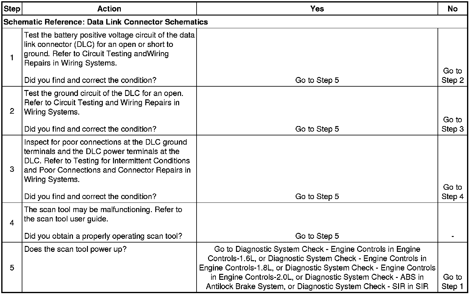The data link connector (DLC) provides operating power for the scan tool at terminal 16. The ground for the scan tool is provided at terminal 4. The 16 pin DLC provides the serial data signals at terminal 7 - ECM, TCM, terminal 3 - speed sensitive power steering, terminal 12 - EBCM, and terminal 13 - SIR serial data. The scan tool will power up with the ignition OFF. The ignition must be ON in order for the scan tool to communicate with a control module.