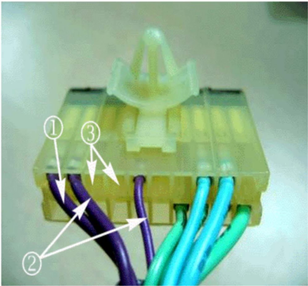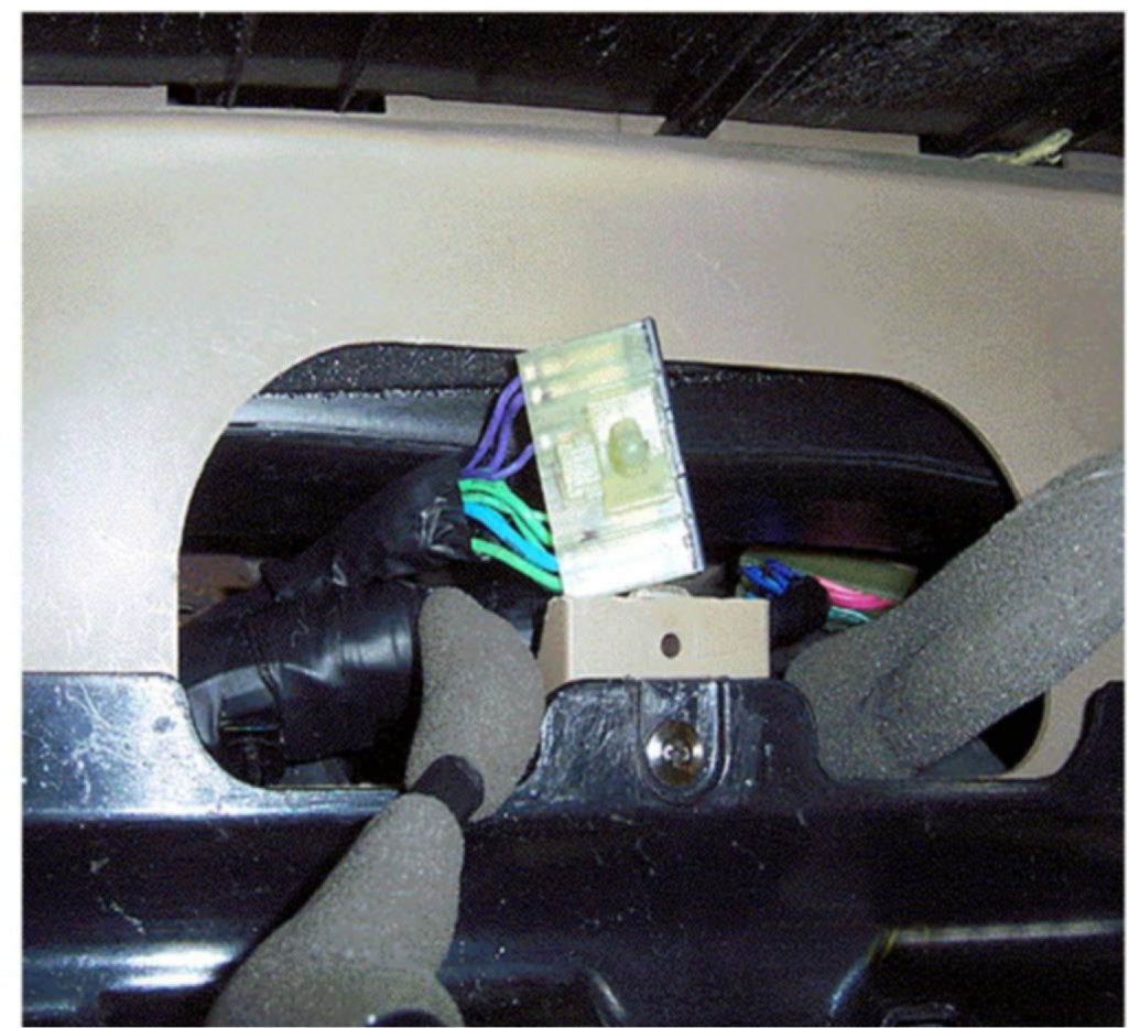 4. Pull the splice pack out from in between the A/C duct and dash support structure. Inspect the splice pack for the three purple wires shown above. Cut the three purple wires indicated by callouts 1 through 3 well away from any melted or damaged areas close to the splice pack. The two inboard wires may be found in the cavities indicated by either callout 2 or 3. (Wires in illustration above are shown at position of callout 2.)