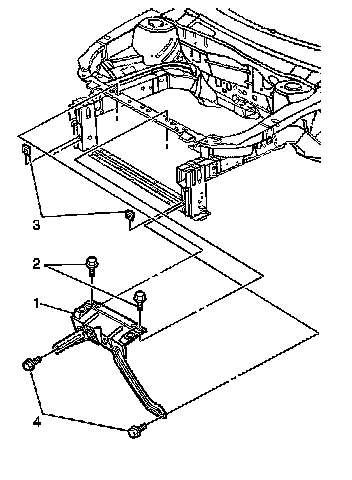 7. Remove the 2 lower hood latch support bolts (4).