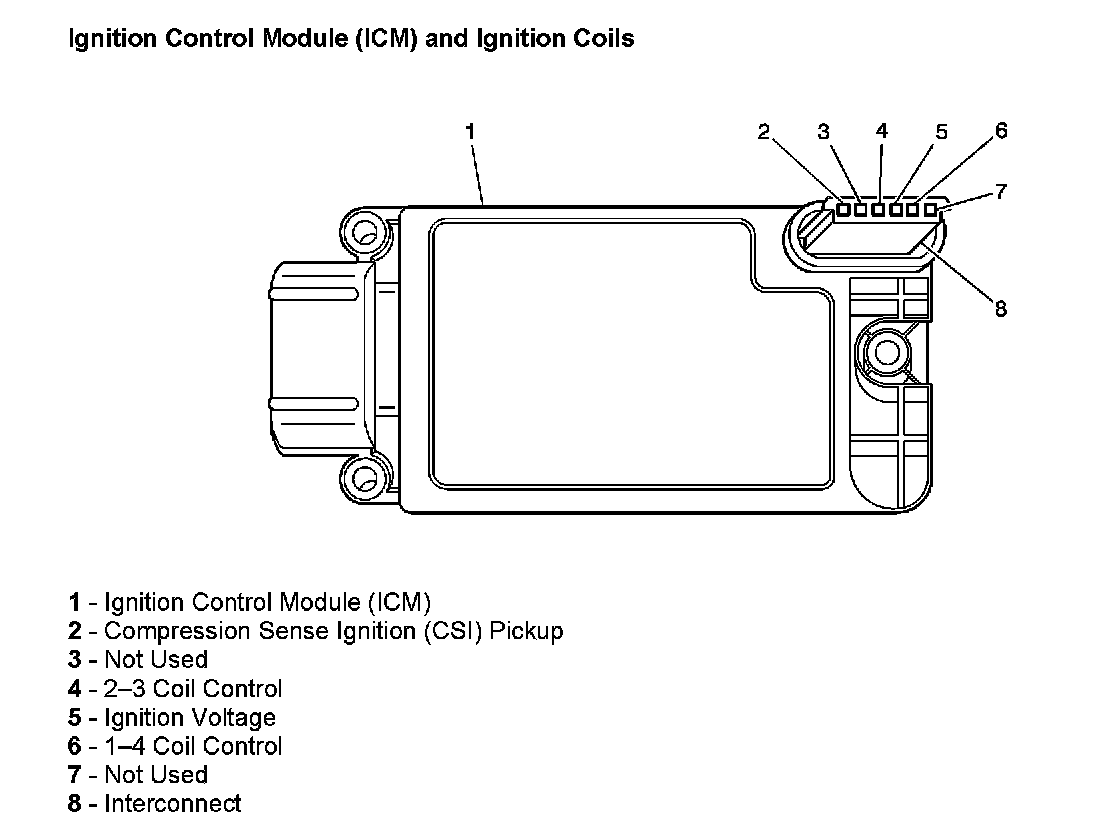 The powertrain control module (PCM) supplies a signal on each of the ignition control (IC) timing control circuits to the ignition control module (ICM). The ICM fires the correct ignition coil at the correct time based on the signals. The ICM detects if cylinder 1 or cylinder 3 is on the compression stroke by sensing the secondary voltage and polarity of each side of the ignition coil. The ICM detects this voltage with sensing circuitry integrated into each ignition coil. The higher voltage is on the compressing cylinder. This is called compression sense ignition. The ICM provides a synthesized cam signal to the PCM based on these inputs. The PCM uses the cam signal to synchronize fuel injection.