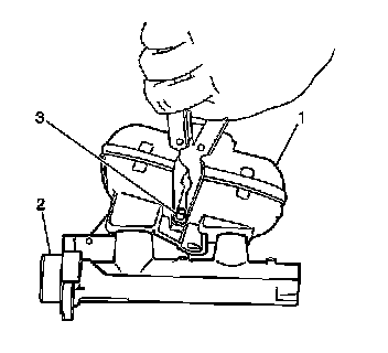 2. Remove the brake fluid level sensor (3). Using needle nose pliers, carefully depress the retaining tabs on the end of the brake fluid level sensor and press the sensor through the reservoir (1) to remove.