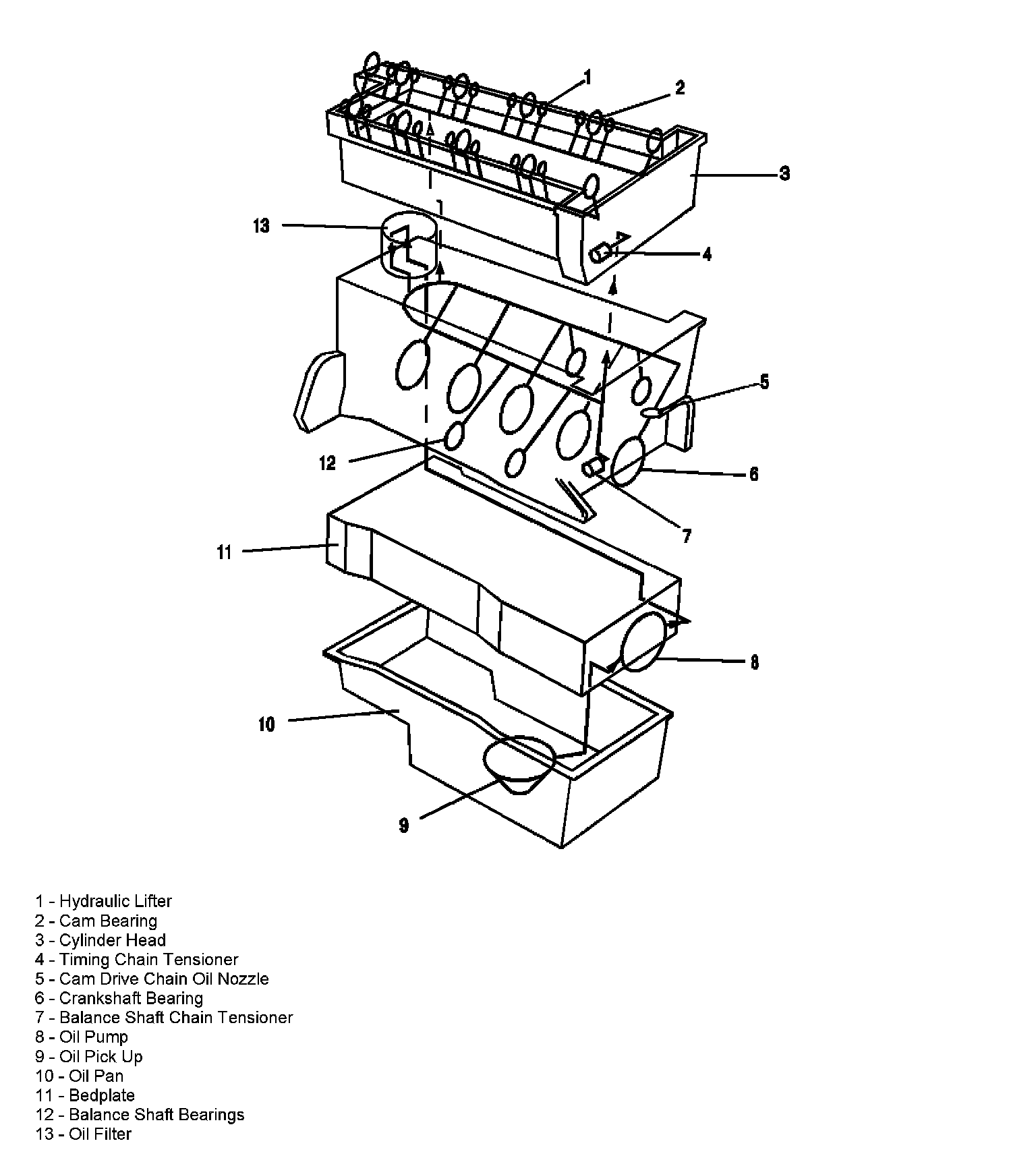 Oil is applied under pressure to the crankshaft, connecting rods, balance shaft assembly, camshaft bearing surfaces, valve lifters and timing chain hydraulic tensioner. All other moving parts are lubricated by gravity flow or splash. Oil enters the gerotor type oil pump thorough a fixed inlet screen. The oil pump is driven by the crankshaft. The oil pump body is within the engine front cover. The pressurized oil from the pump passes through the oil filter. The oil filter is located on the right (front) side of the engine block. The oil filter is housed in a casting that is integrated with the engine block. The oil filter is a disposable cartridge type. A by-pass valve in the filter cap allows continuous oil flow in case the oil filter should become restricted. Oil then enters the gallery where it is distributed to the balance shafts, crankshaft, camshafts and camshaft timing chain oiler nozzle. The connecting rod bearings are oiled by constant oil flow passages through the crankshaft connecting the main journals to the rod journals. A groove around each upper main bearing furnishes oil to the drilled crankshaft passages. The pressurized oil passes through the cylinder head restrictor orifice into the cylinder head and then into each camshaft feed gallery. Cast passages feed each hydraulic element adjuster and drilled passages feed each camshaft bearing surface. An engine oil pressure switch or sensor is installed at the end. Oil returns to the oil pan through passages cast into the cylinder head. The timing chain lubrication drains directly into the oil pan.