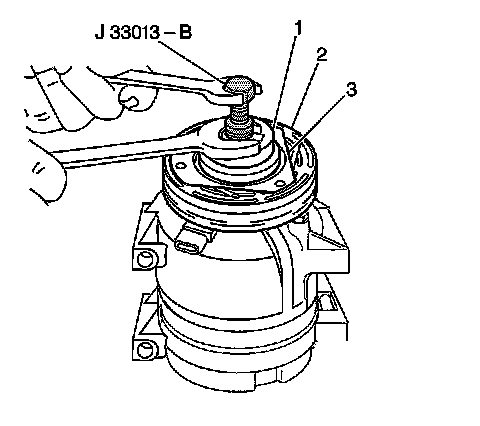 5. Install the J 33013-B remover-installer with bearing (1) into the clutch plate (3) and hub assembly (2).