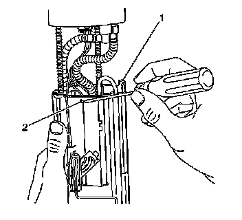 5. Depress the tab on the fuel level sensor (1) while sliding up and out of the housing.