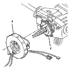3. Align the SIR coil assembly (1) with the horn tower on the turn signal cancel cam assembly (2).
