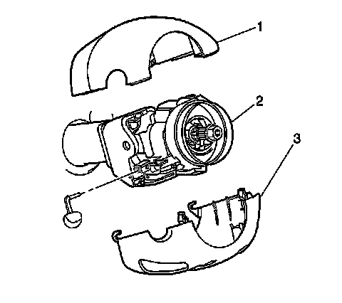 2. Remove the upper column trim cover (1) tilting up and unsnapping from the lower column trim cover hinges (3).
