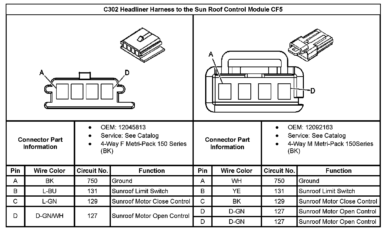 C302 Headliner Harness to the Sun Roof Control Module (With RPO Code CF5):