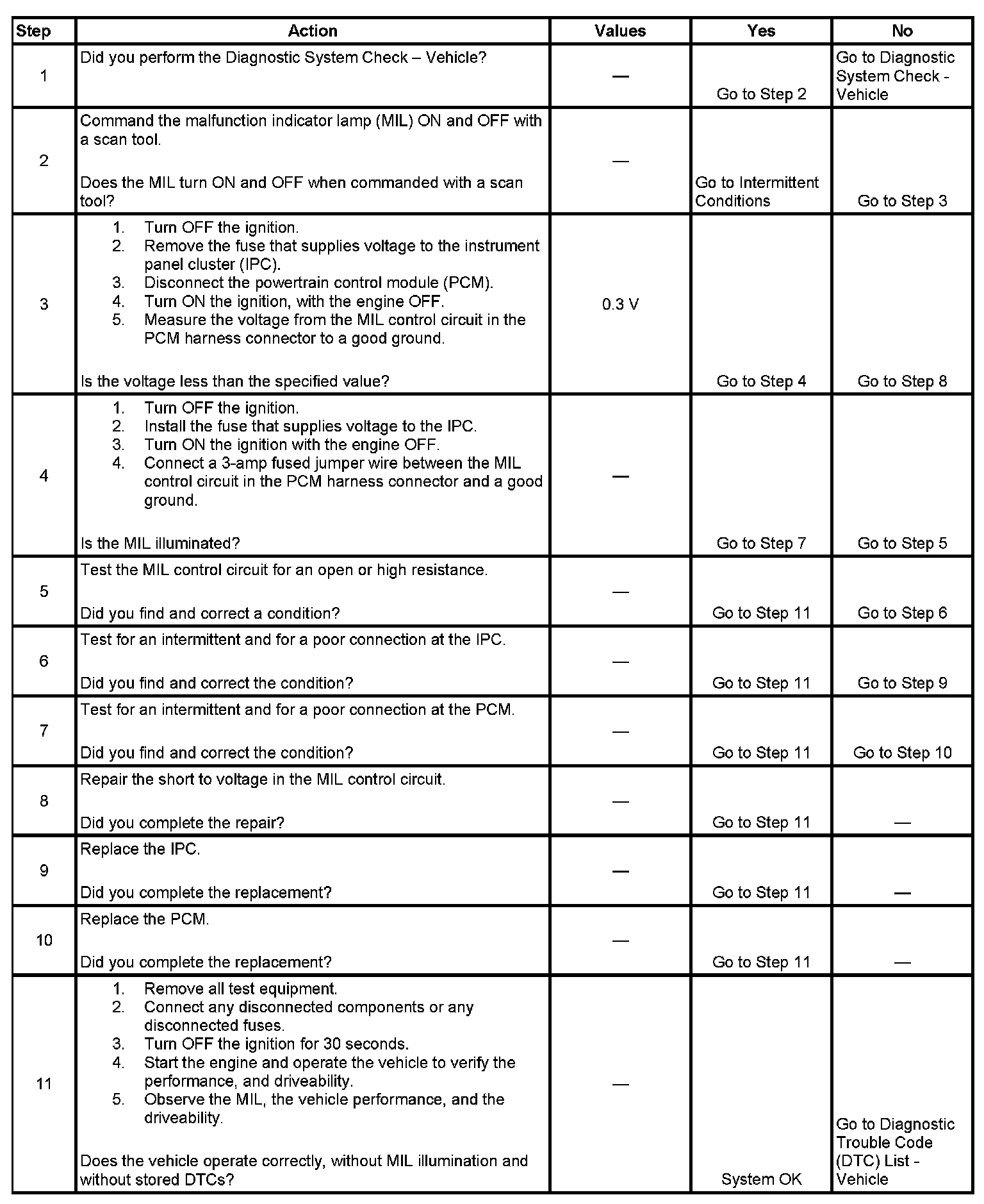 Ignition voltage is supplied to the MIL. The powertrain control module (PCM) turns the MIL ON by grounding the MIL control circuit. There should be a steady MIL with the ignition ON and the engine OFF.