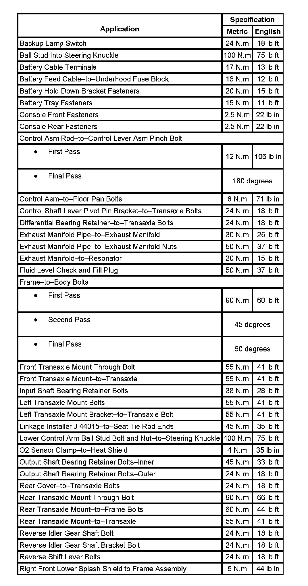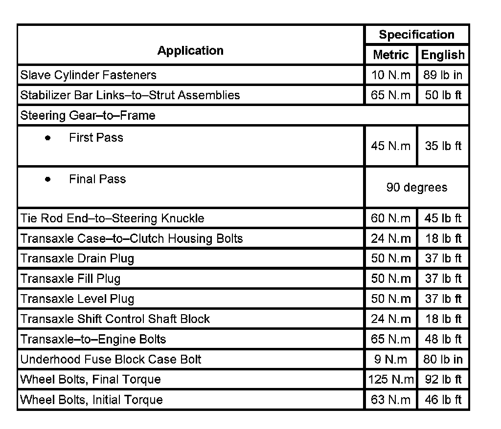 Fastener Tightening Specifications: