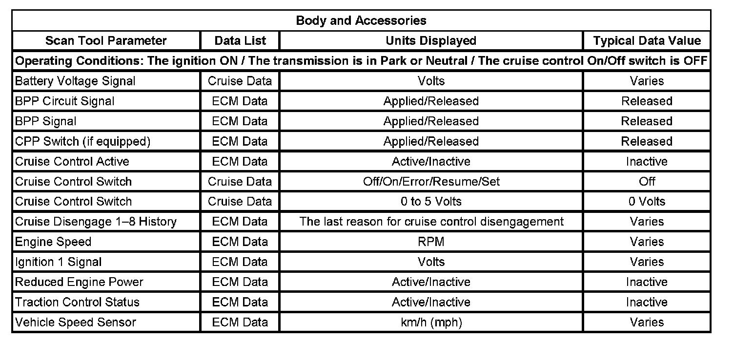 The scan tool data lists contain all of the cruise control related parameters that are available on the scan tool. The parameters in the list are arranged in alphabetical order. The data list column indicates the location of the parameter within the scan tool menu selections.