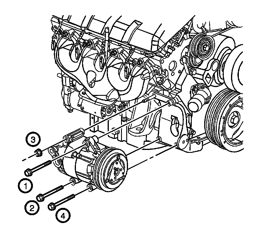 6. Remove the A/C compressor mounting bolts (1, 2, 4).