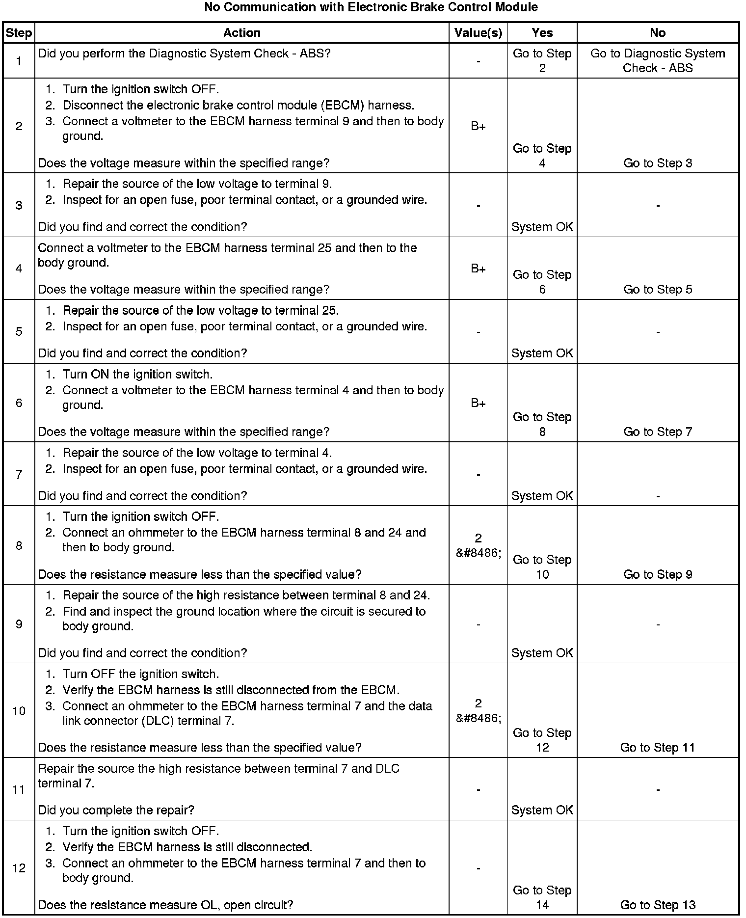 Serial data is transmitted/received by the electronic brake control module (EBCM) through terminal 7. The EBCM is supplied with constant battery feed voltage through terminals 9 and 25, and switched ignition voltage through terminal 4. The EBCM ground is provided through terminal 8 and 24.