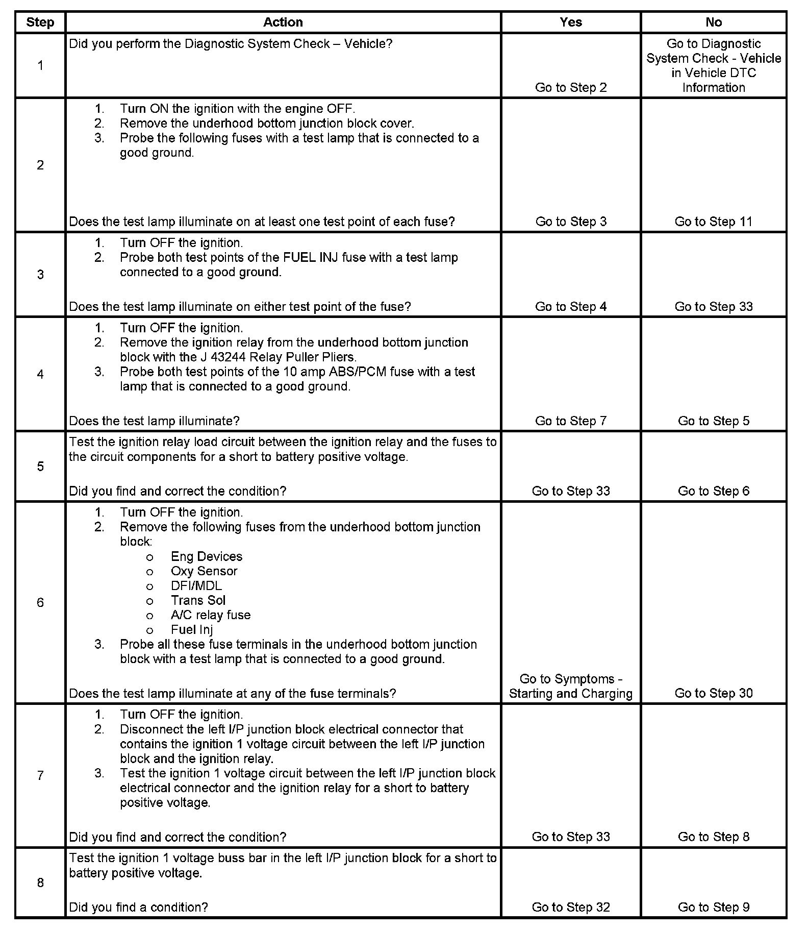 The ignition relay table assumes that the vehicle battery is fully charged. Refer to Battery Inspection/Test in Starting and Charging. Battery Inspection/Test