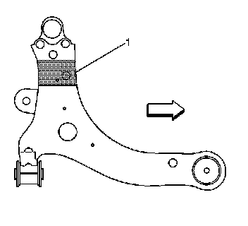 When lifting the vehicle with a suspension-contact lift, place the front post lift points at the lower control arms in the area shown (1). Lift the rear of the vehicle with the rear post lift points ONLY under the rear wheels.
