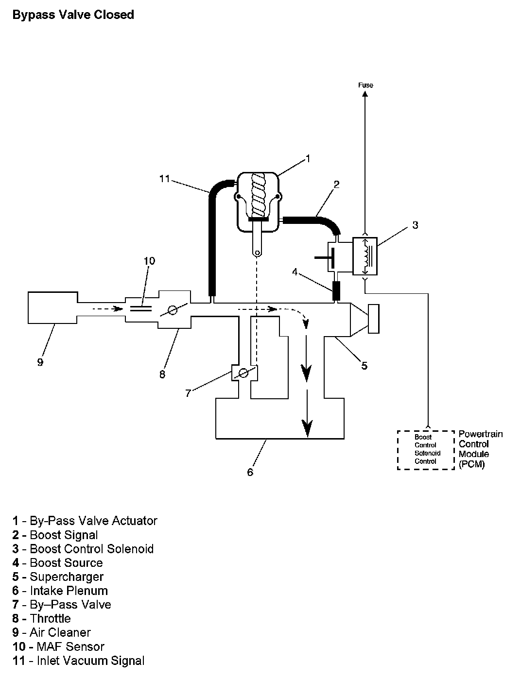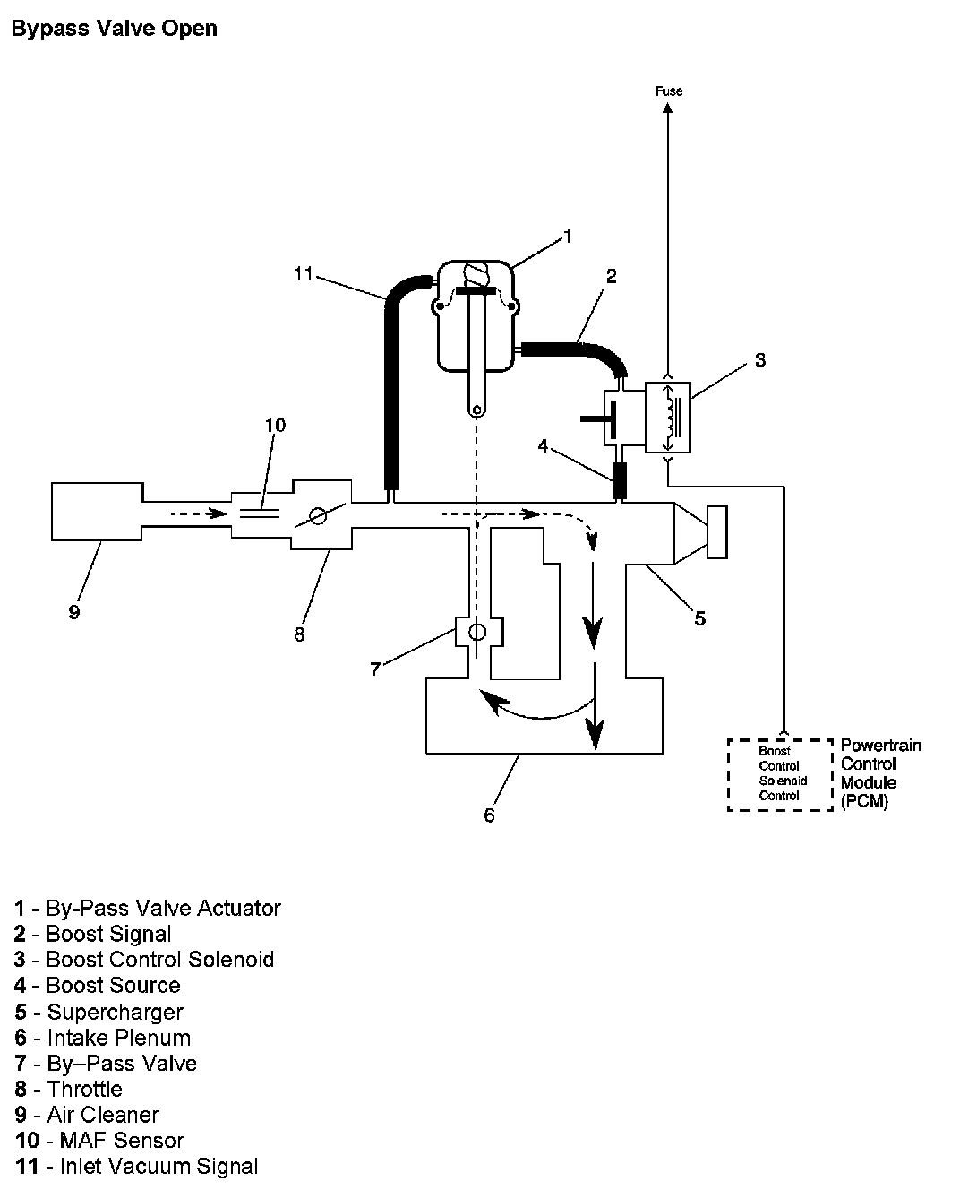 The PCM controls boost pressure by using the boost control solenoid. The boost control solenoid is normally an open valve. Under most conditions, the PCM commands the boost control solenoid to operate at a 100 percent duty cycle. This keeps the solenoid valve closed and allows only inlet vacuum to control the position of the bypass valve. At idle, engine vacuum is applied to the upper side of the bypass valve actuator, counteracting spring tension to hold the bypass valve open. As engine load is increased, engine vacuum is decreased, causing the spring in the bypass valve actuator to overcome the applied vacuum, closing the bypass valve and allowing the boost pressure to increase. When reduced boost pressure is desired, the PCM commands the boost control solenoid to operate at a 0 percent duty cycle. This opens the solenoid valve and allows boost pressure to enter the bypass valve actuator at the lower side to counteract the spring tension, opening the bypass valve and recirculating excess boost pressure back into the supercharger inlet.