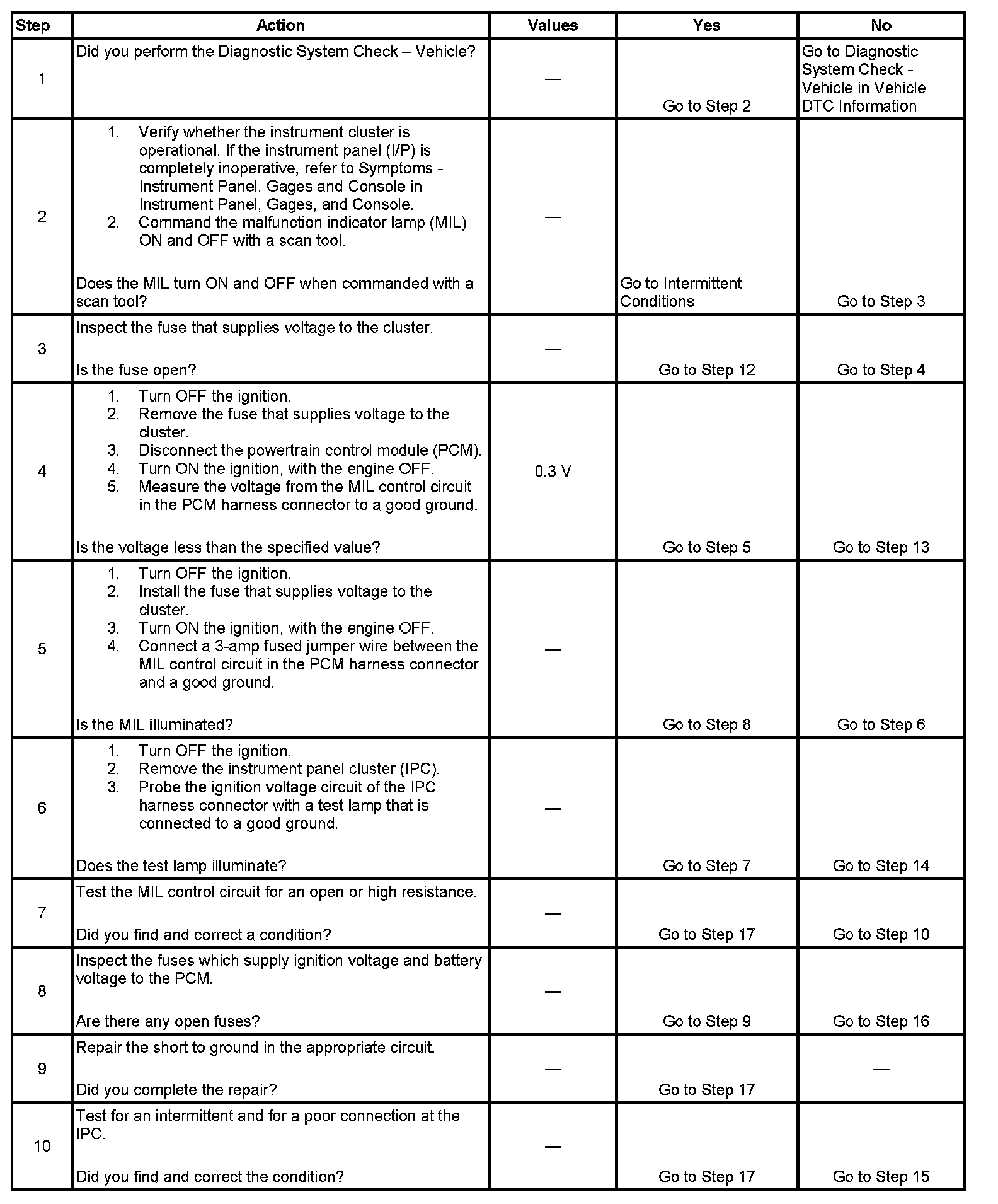 Ignition voltage is supplied to the malfunction indicator lamp (MIL). The powertrain control module (PCM) turns the MIL ON by grounding the MIL control circuit.