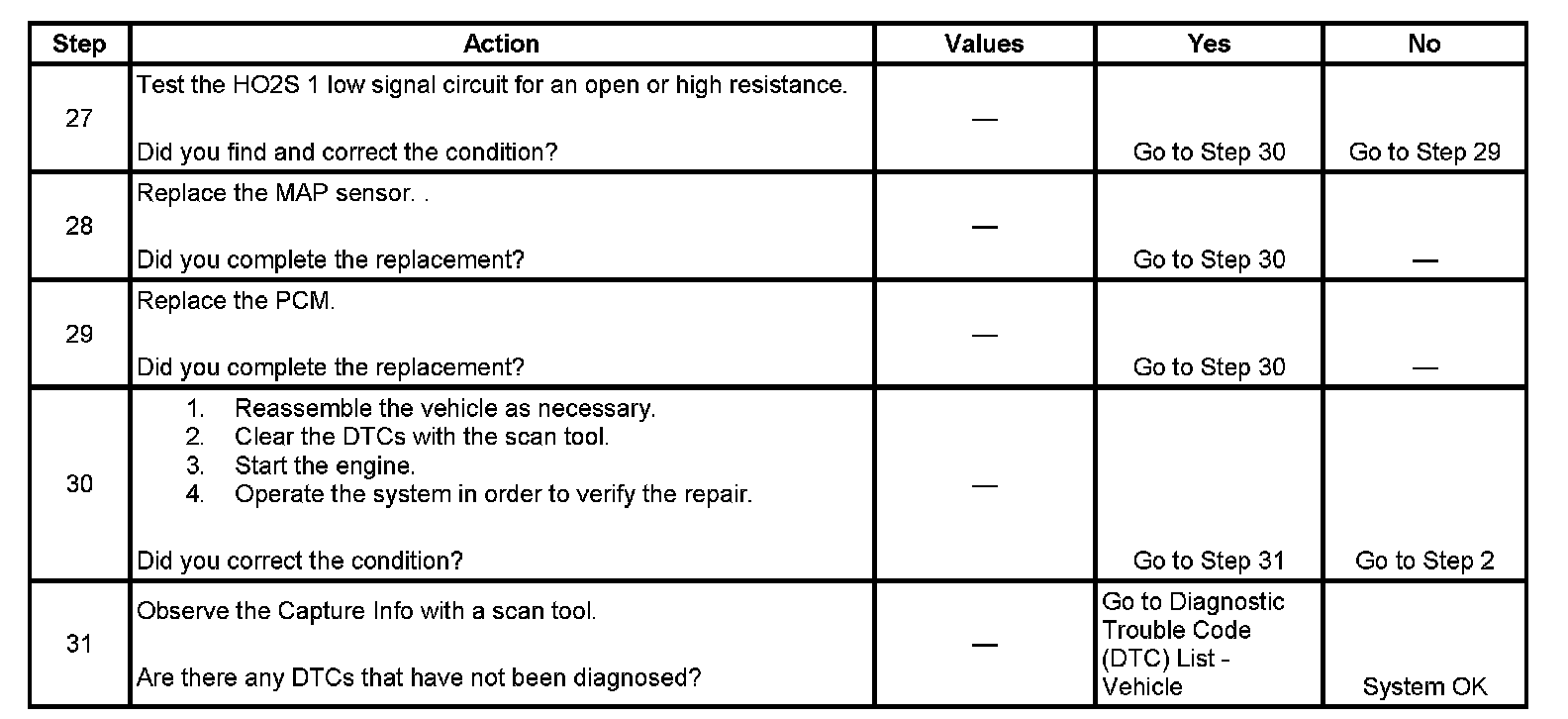 The numbers below refer to the step numbers on the diagnostic table.