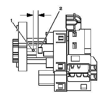 2. Locate the surface for the release button (2) for the ignition switch lock cylinder on the plastic ignition switch housing. Center punch a location (1) on the rib approximately 3/8 inch reward, toward the key entry end, from the cylinder release button.